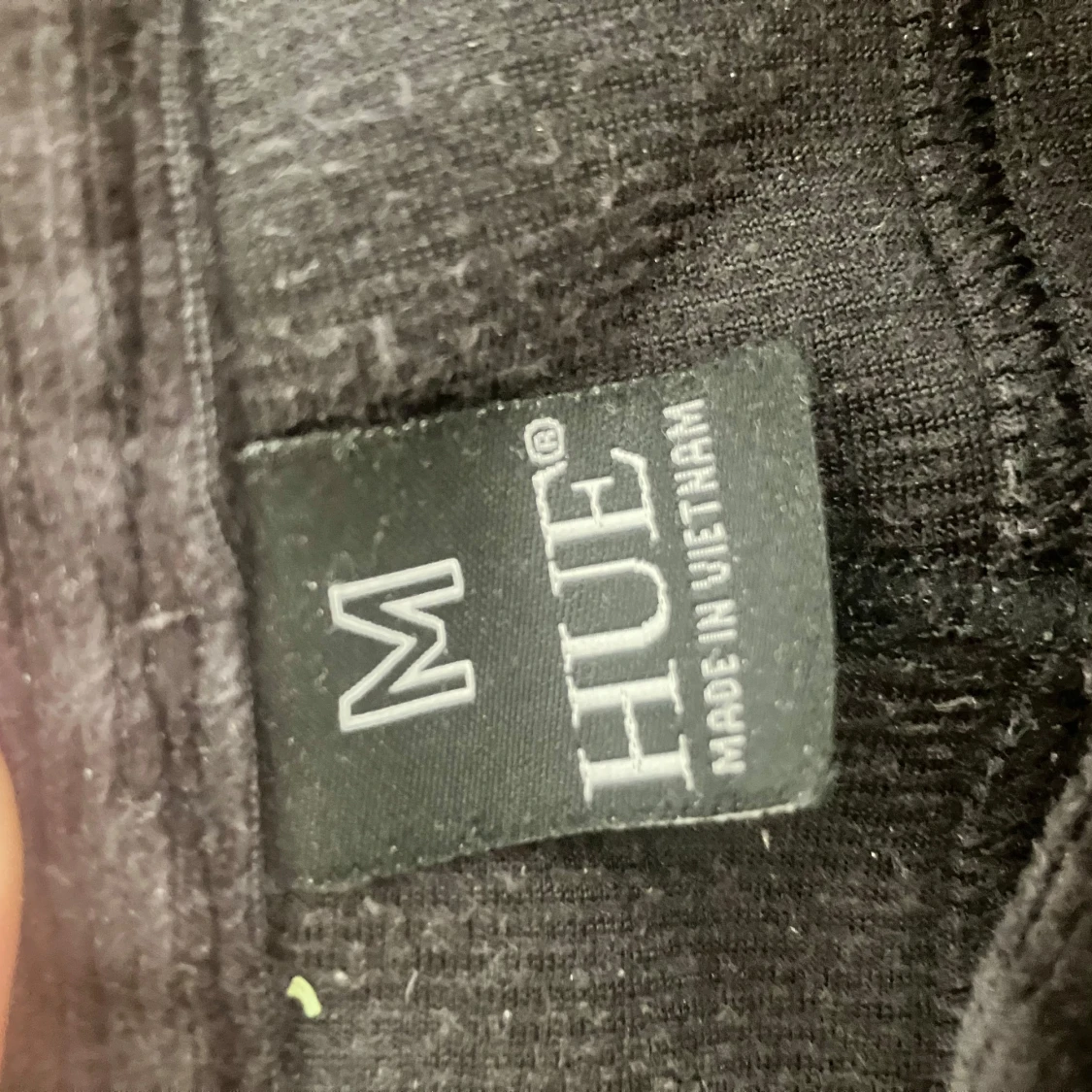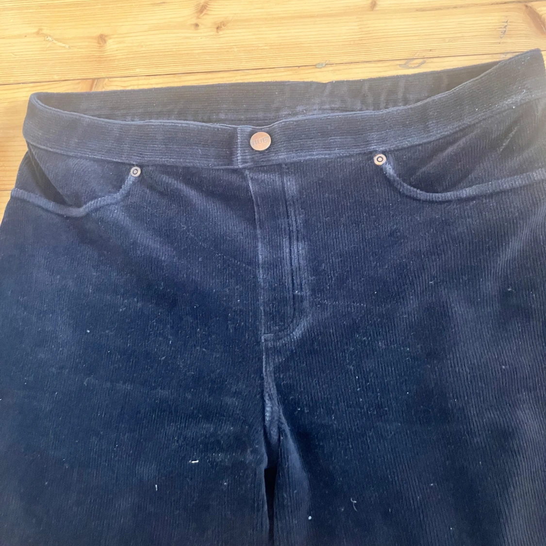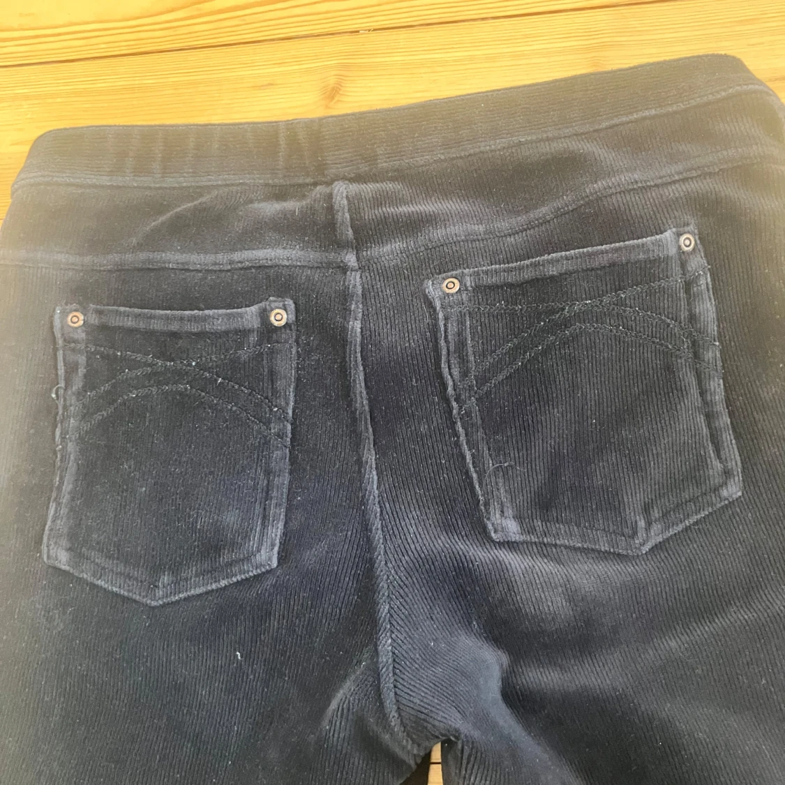 Snygga svarta byxor som är mjuka och har bootcut-stil och är randiga. Byxorna har klassiska fem fickor och en knapp framtil, det står ingen storlek men skulle gissa mellan S-M