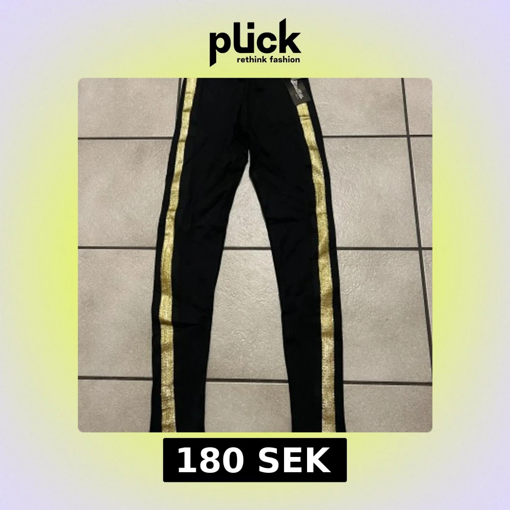 Snygga svarta byxor från Miss Mello med glittriga guldremsor längs sidorna. Perfekta för att sticka ut med en touch av glamour. Byxorna har en tight passform och är tillverkade i ett bekvämt syntetmaterial.
