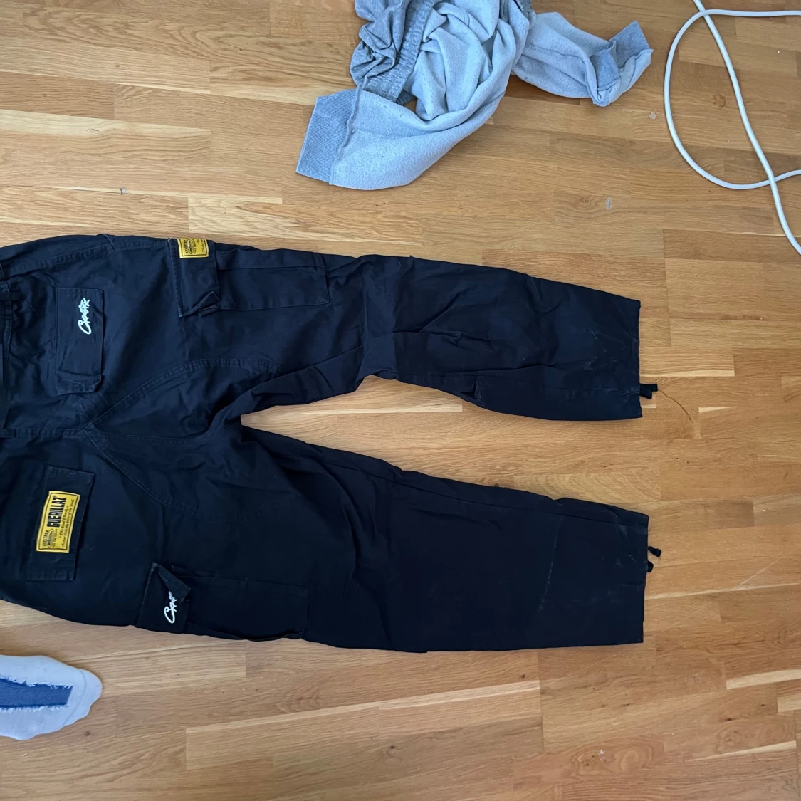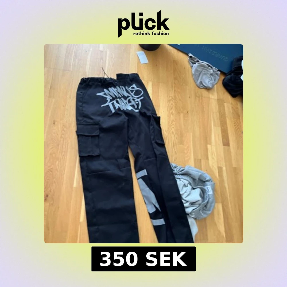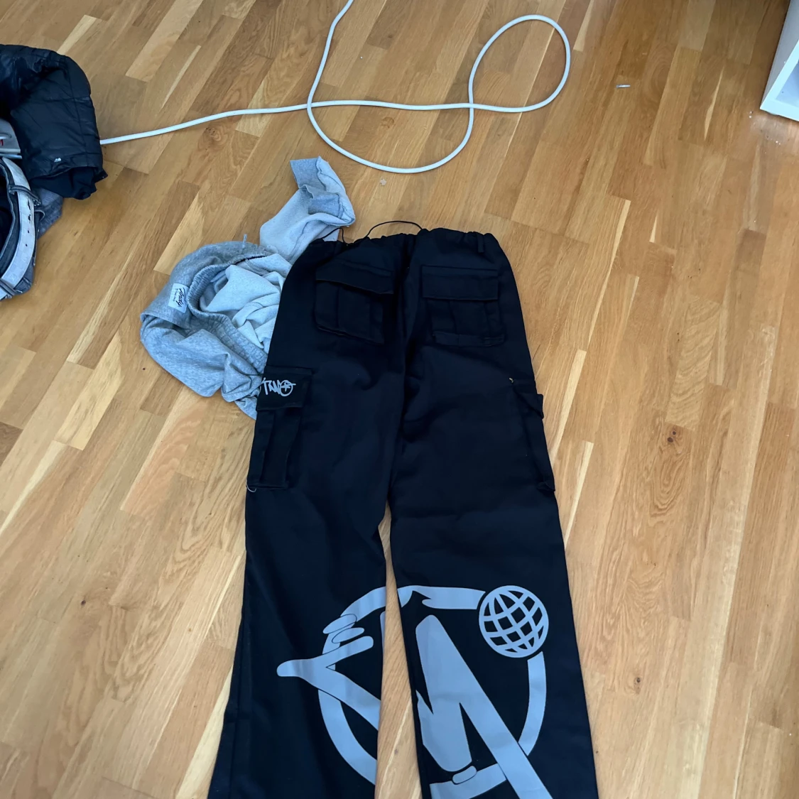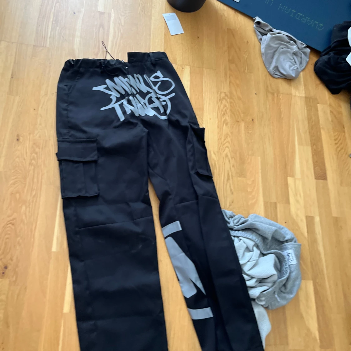 Svarta cargobyxor med stora tryck i vitt och grått. Byxorna har flera fickor och en lös passform. Perfekta för en avslappnad stil.