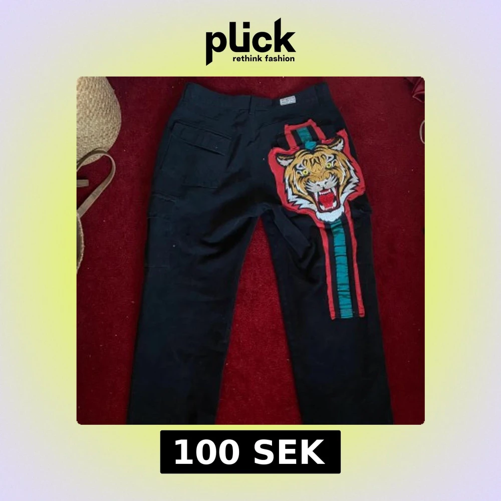 svarta cargobyxor från Wampum med påsydd broderad tiger på baksidan av ena benet. Byxorna har flera fickor, tigern är också en ficka. 84cm innerbenslängd. 90cm runt hela midjan. 114cm från midja till längst ned. står size 38 i byxorna.
