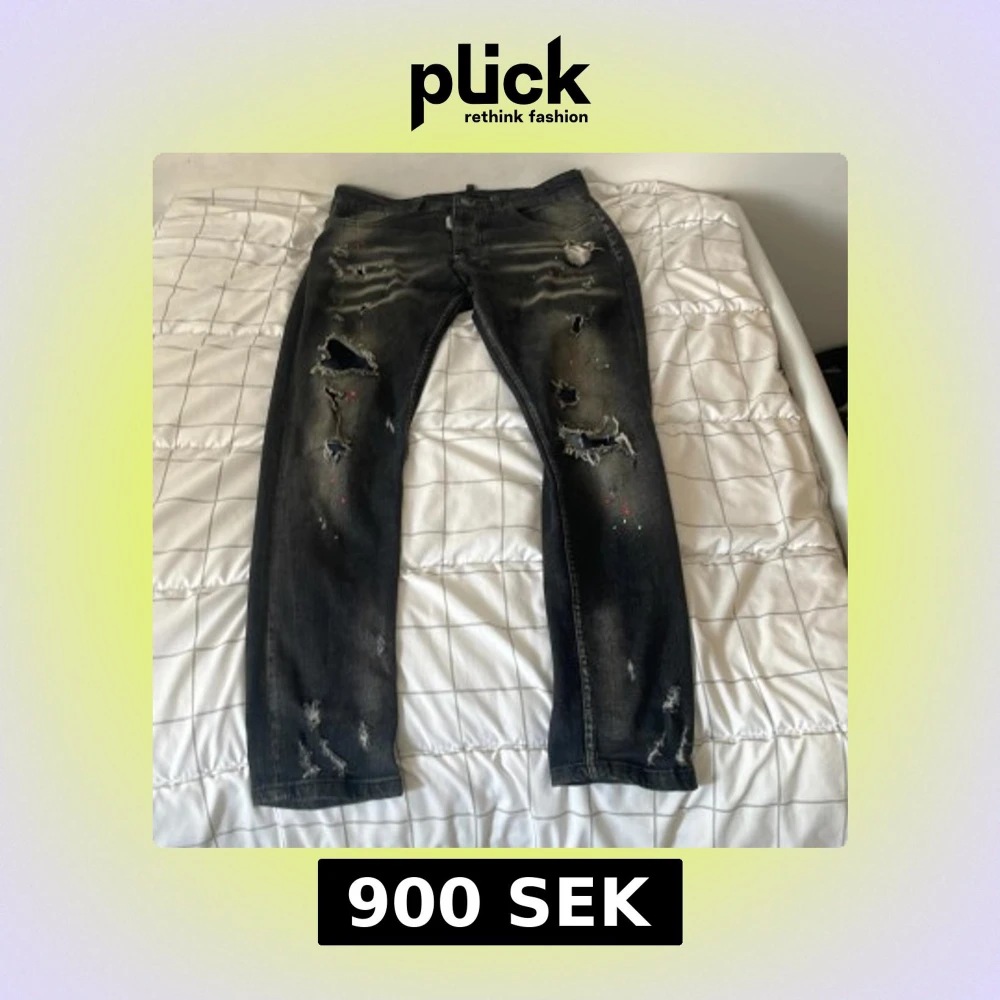 Säljer ett par svarta jeans från Dsquared2 med slitna detaljer, hål och färgstänk i rött och grönt. Jeansen har klassisk femficksdesign och raka ben. Materialet är denim och de har en cool, edgy vibe som sticker ut.