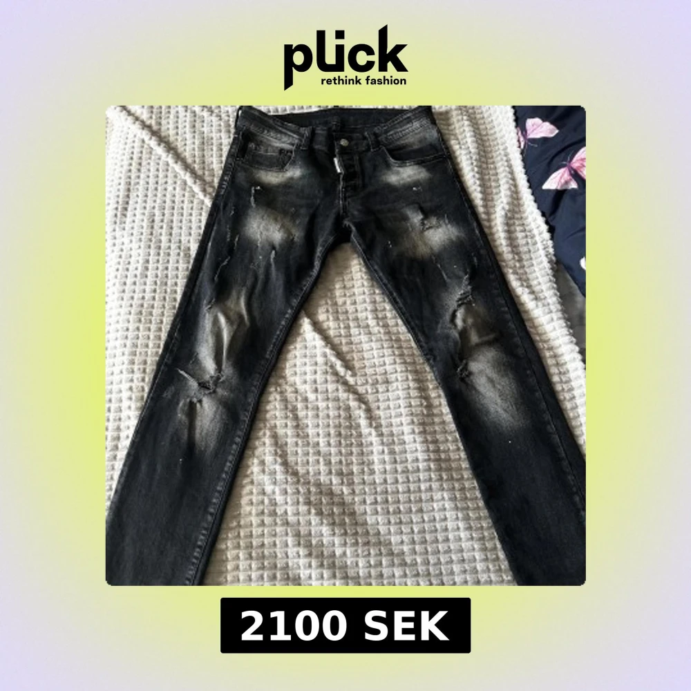 Säljer ett par svarta Dsquared2 ICON jeans från Ibrahimovic-kollektionen. Jeansen har slitna detaljer, skinny fit och coola blekta partier. Klassisk femficksmodell med Dsquared2-logga vid gylfen och stor ICON-lapp bak. Nypris:4700
