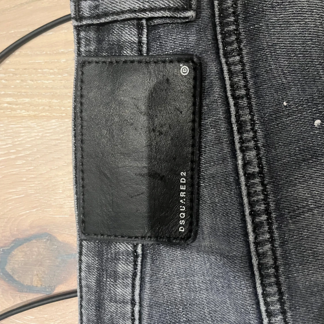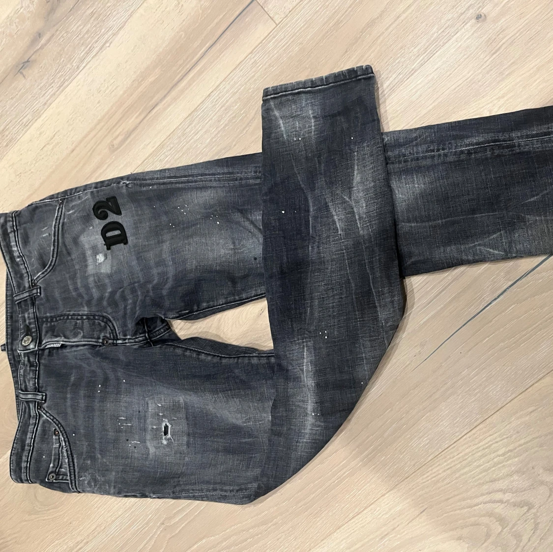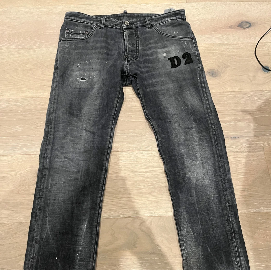Snygga svarta jeans från Dsquared2 med D2-tryck på ena fickan. Jeansen har en tvättad look med slitningar och små färgstänk för en cool vibe. Tillverkade i bomull med lite elastan för skön stretch. Klassisk femficksmodell och raka ben.