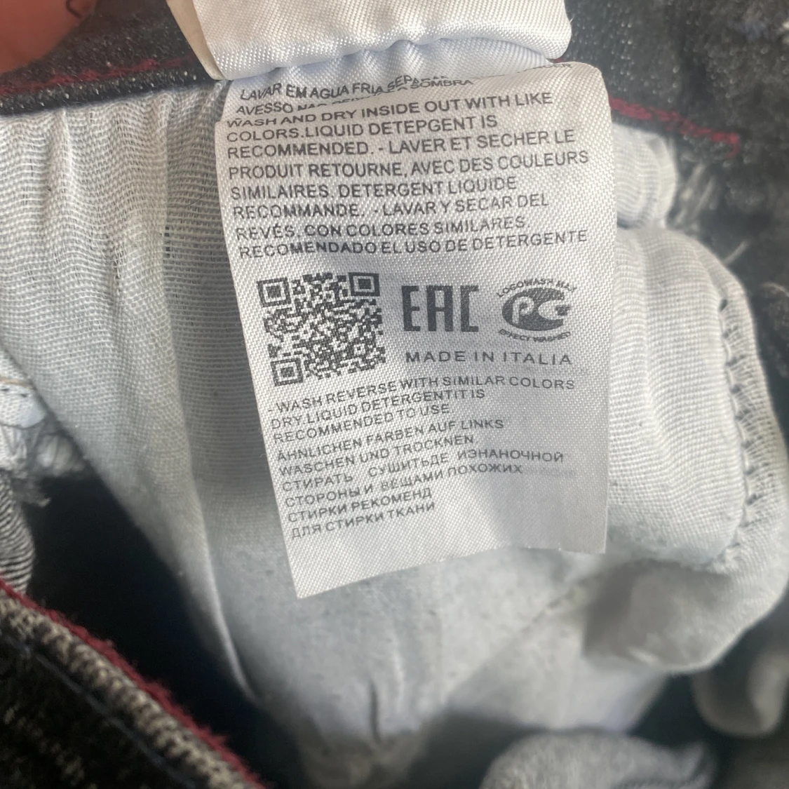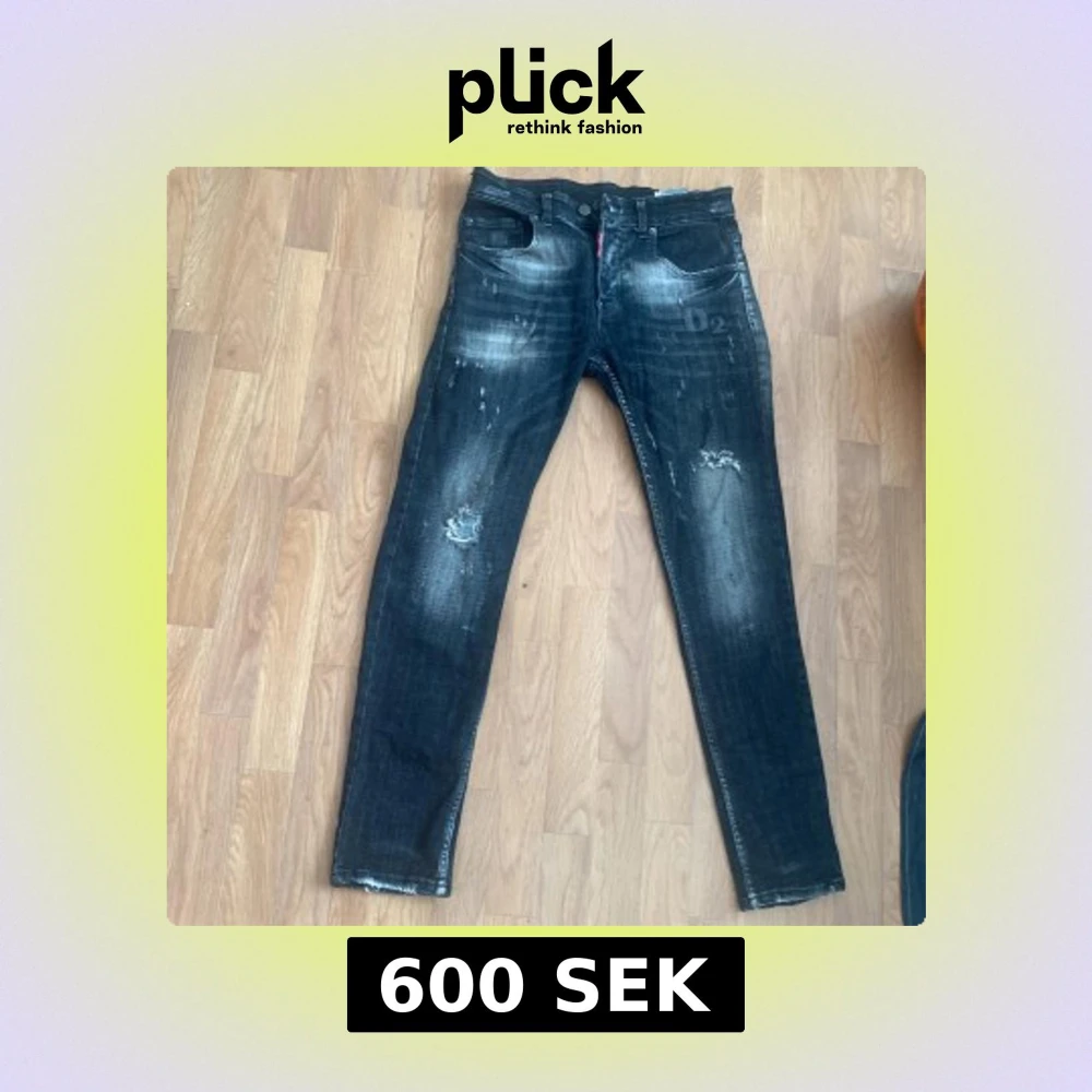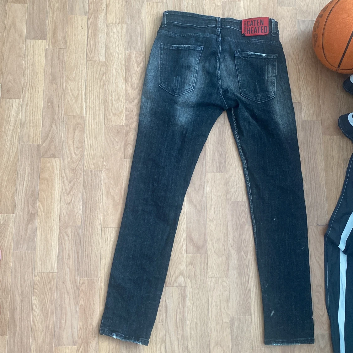 Säljer ett par svarta jeans från Dsquared2 med coola slitningar och blekta detaljer. Modellen har M passform och klassisk femficksdesign. Röd patch med 'Caten Heated' bak ger extra edge. Perfekta för dig som gillar streetstyle och vill sticka ut.