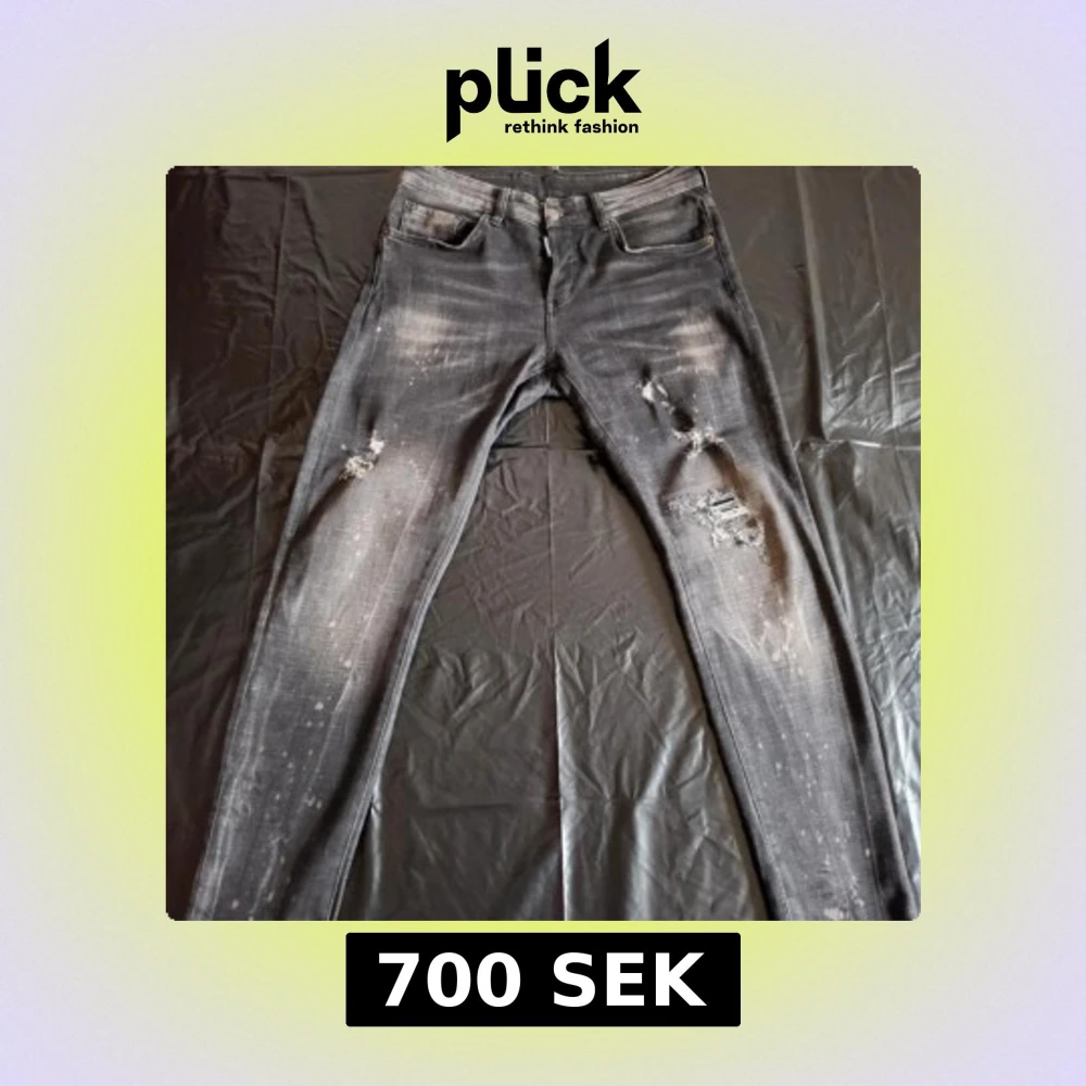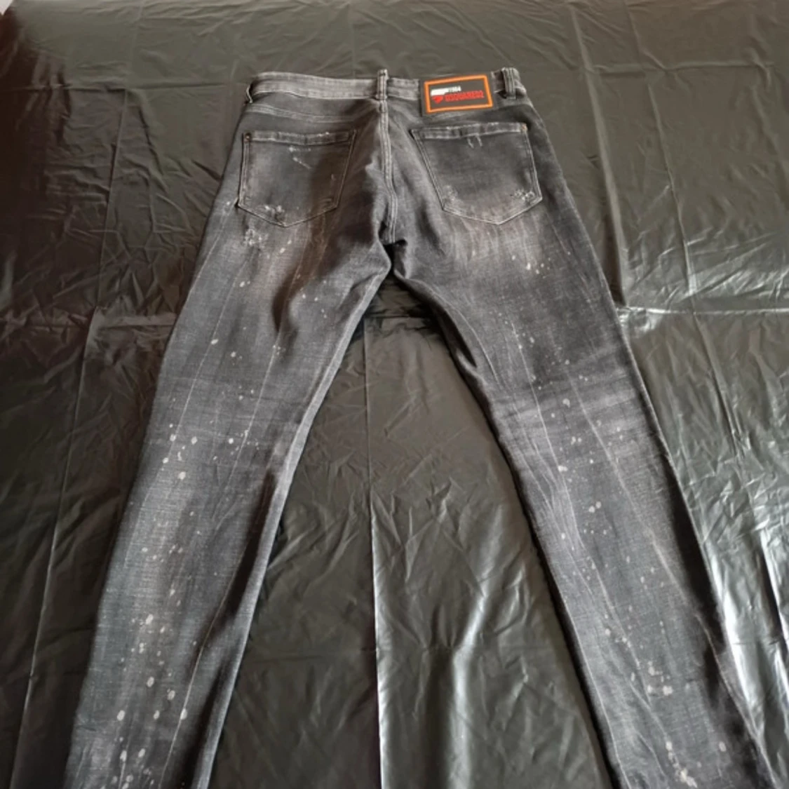 Snygga svarta jeans från Dsquared2 med coola slitningar och färgstänk för en edgy look. Jeansen ör i gott skick
