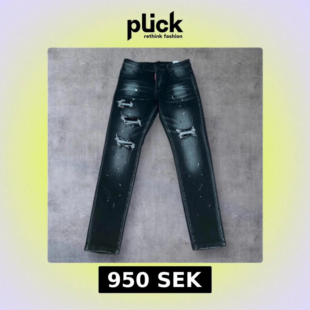 Storlek 29 men passar båda 30 och 28.Snygga svarta jeans från Dsquared2 med slitna detaljer och färgstänk framtill. På bakfickan finns broderade vita blommor och blå brodyr. Jeansen har rak passform och cool streetkänsla, perfekta för dig som vill sticka ut.