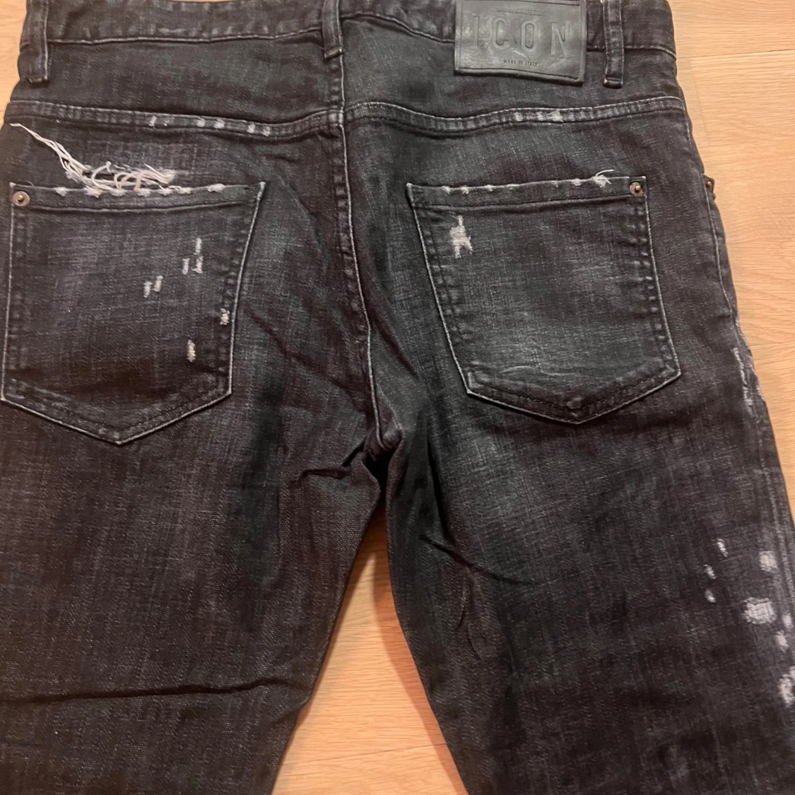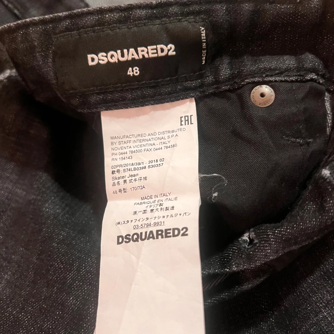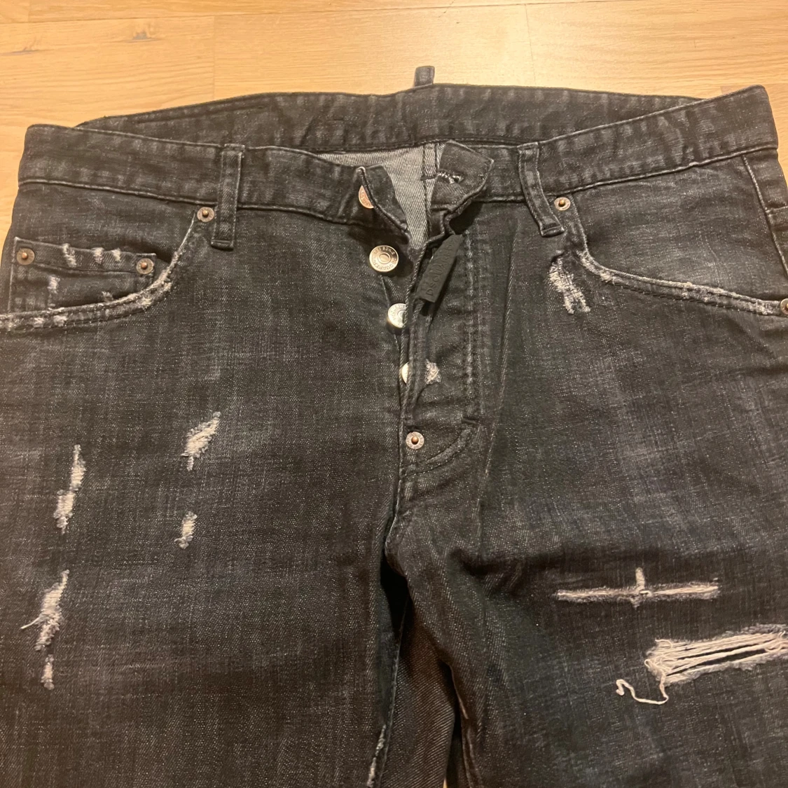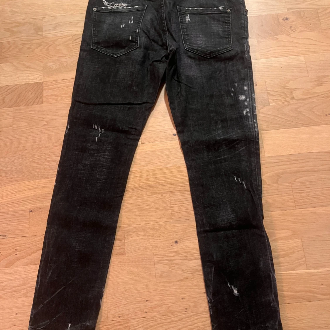 Säljer ett par svarta Dsquared2 Skater Jeans i storlek 48. 98% bomull. De har en snygg distressed look med slitningar och hål, klassisk femficksdesign och knäppning med knappar. Jeansen är i ett stretchigt denimtyg och har en smal passform som sitter riktigt schysst.