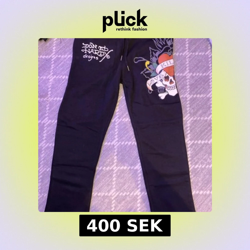 Svarta mjukisbyxor från Ed Hardy med coolt tryck på ena benet med döskalle, hjärta och texten 'Love Kills'. Snyggt Ed Hardy-tryck både fram och bak. Byxorna har snörning i midjan och är gjorda i mjukt material för skön passform. Köptes i USA🤟🏽🤟🏽
