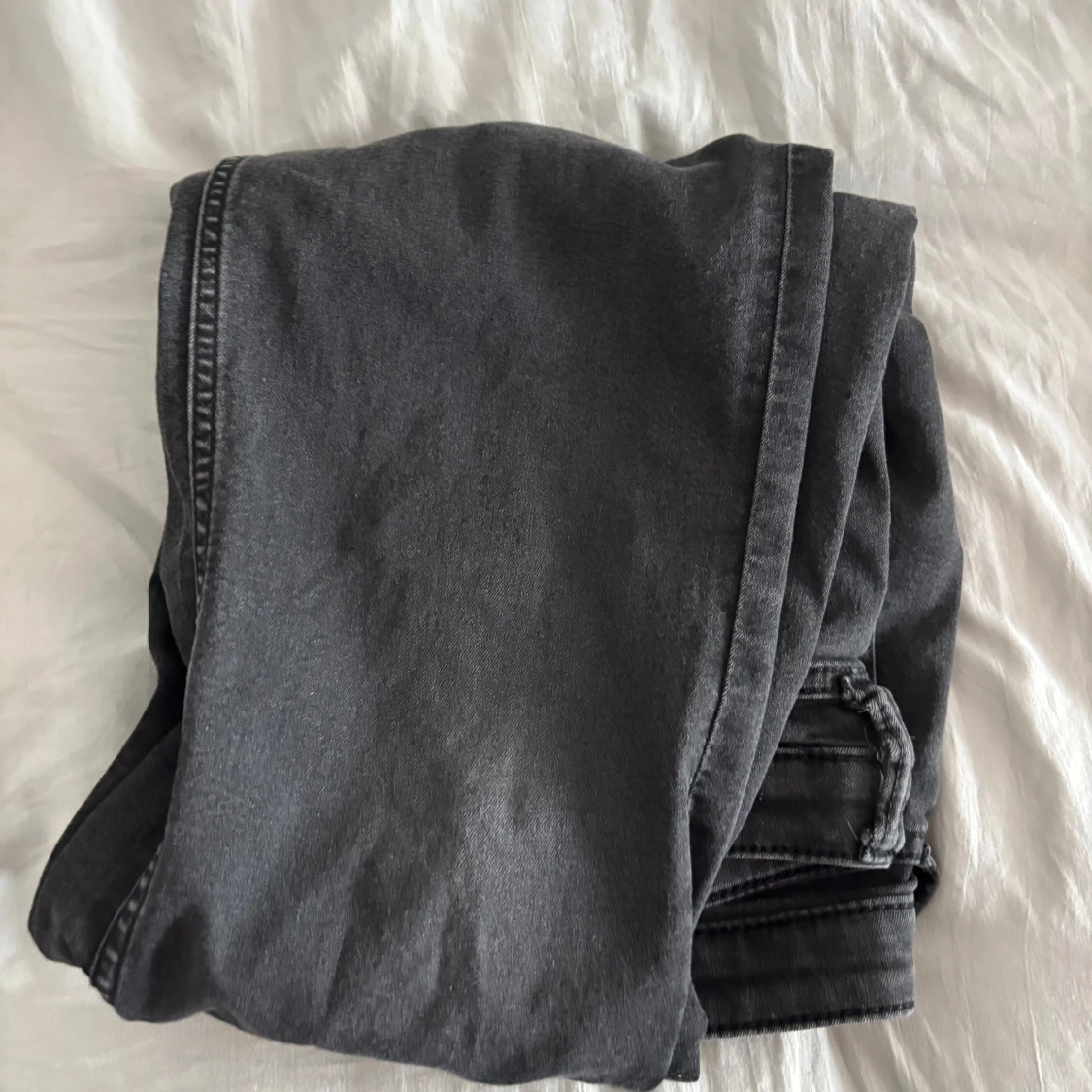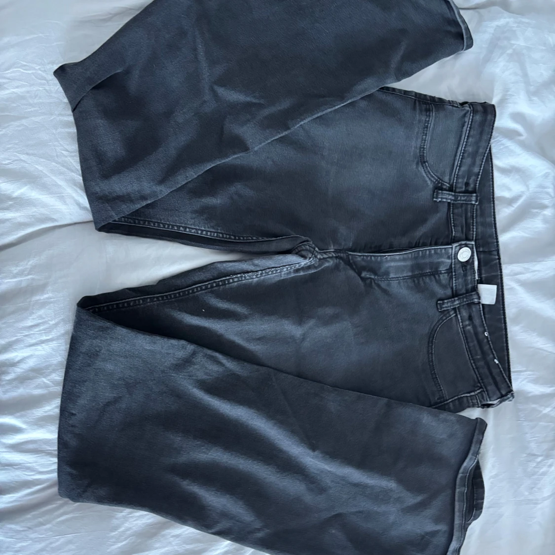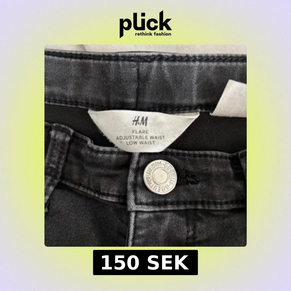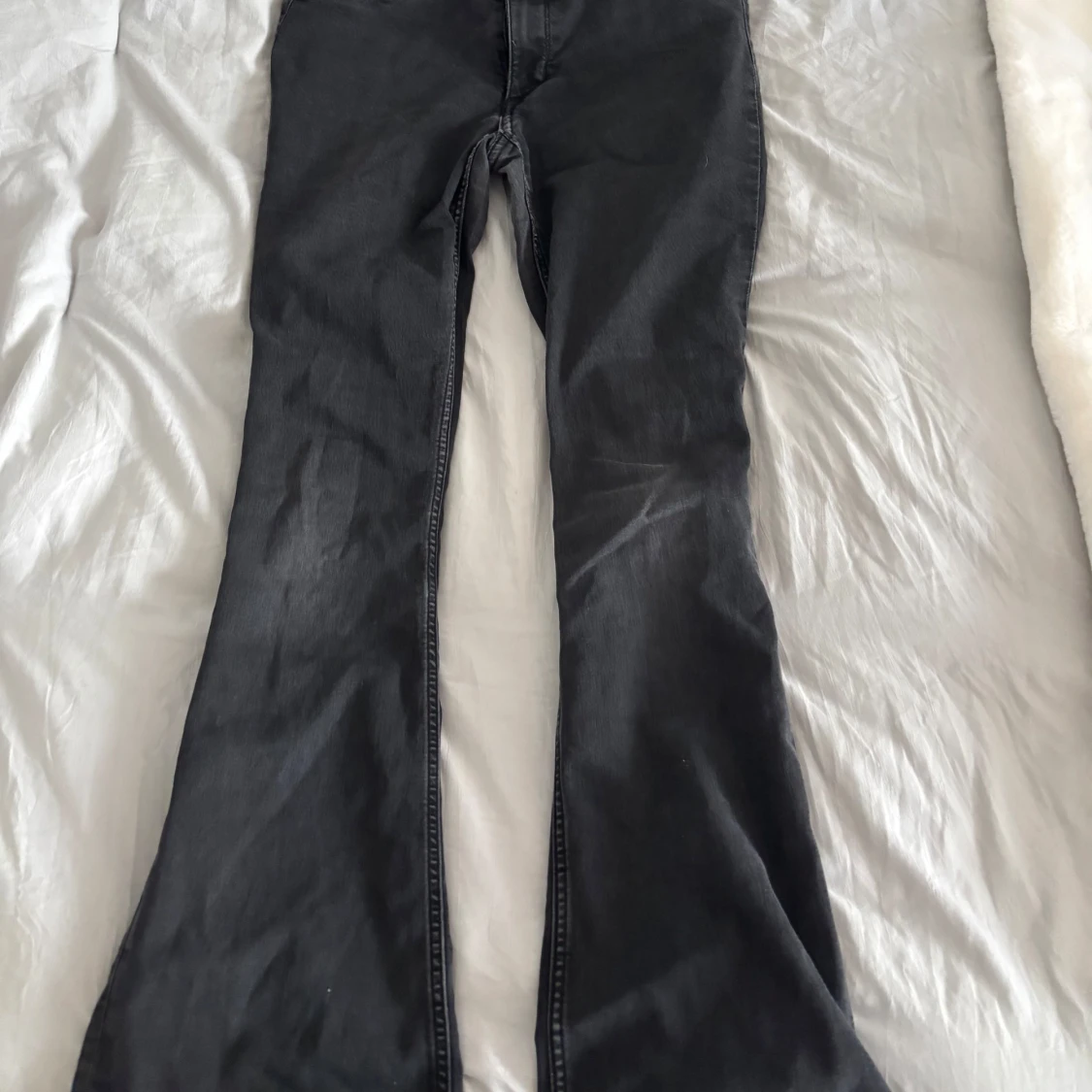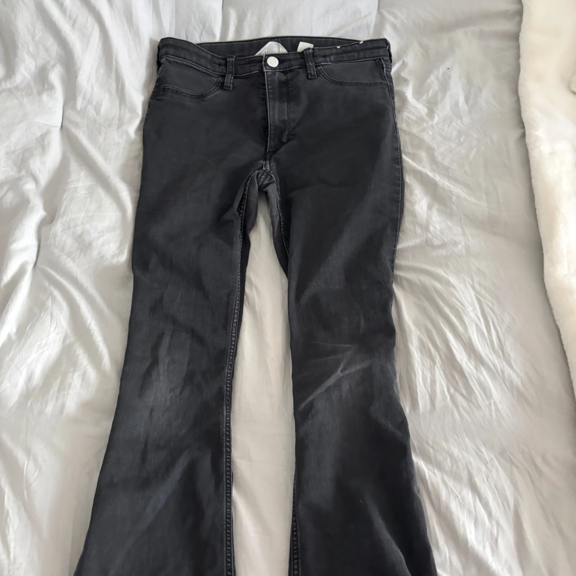 Säljer ett par svarta/mörkgråa flare jeans från H&M med låg midja och justerbar midja. Jeansen har klassisk design och är tillverkade i mjukt denimtyg.