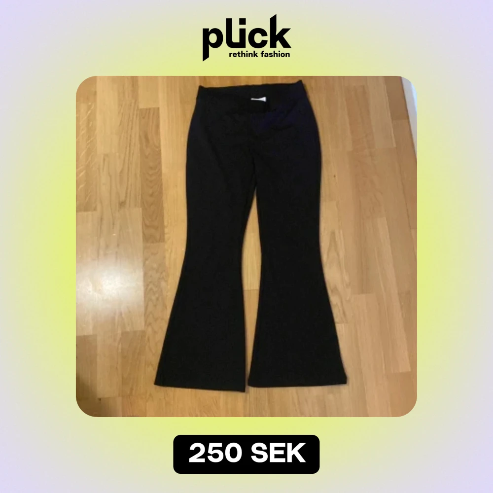 Svarta flared pants i jätte bra skick. Har endast använts ett par få tall gånger. De är 96cm långa och innerbenet är 69cm. Priset kan alltid diskuteras