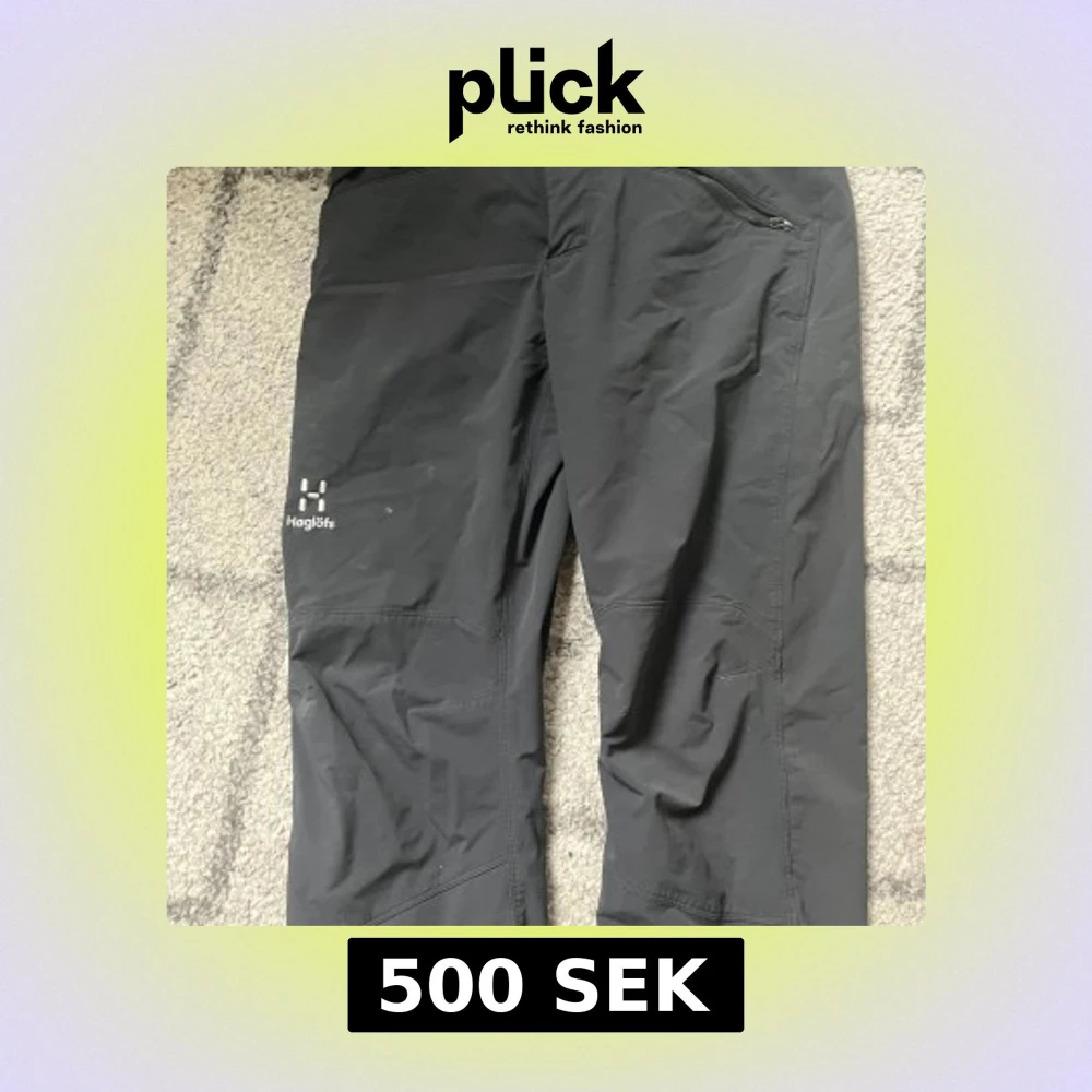 Säljer ett par svarta friluftsbyxor från Haglöfs med dragkedjeförsedda fickor och förstärkta partier vid knäna. Perfekta för utomhusaktiviteter och har en sportig, funktionell design.