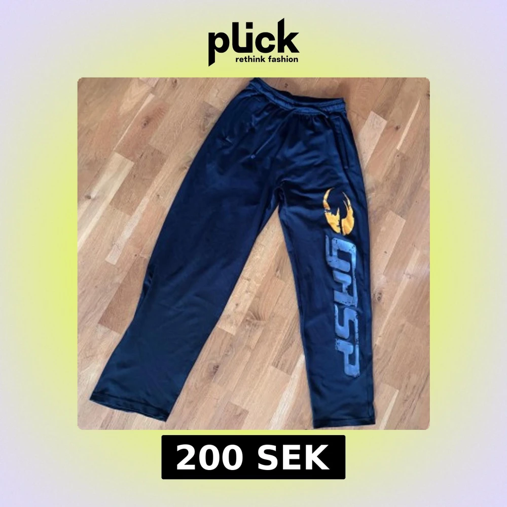Svarta träningsbyxor från GASP med resår i midjan och stort tryck i gult och blått på ena benet. Pris kan diskuteras.