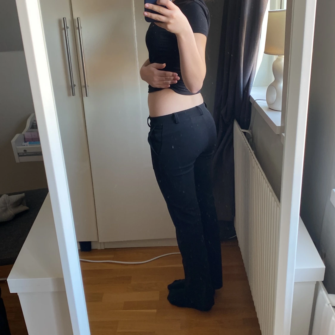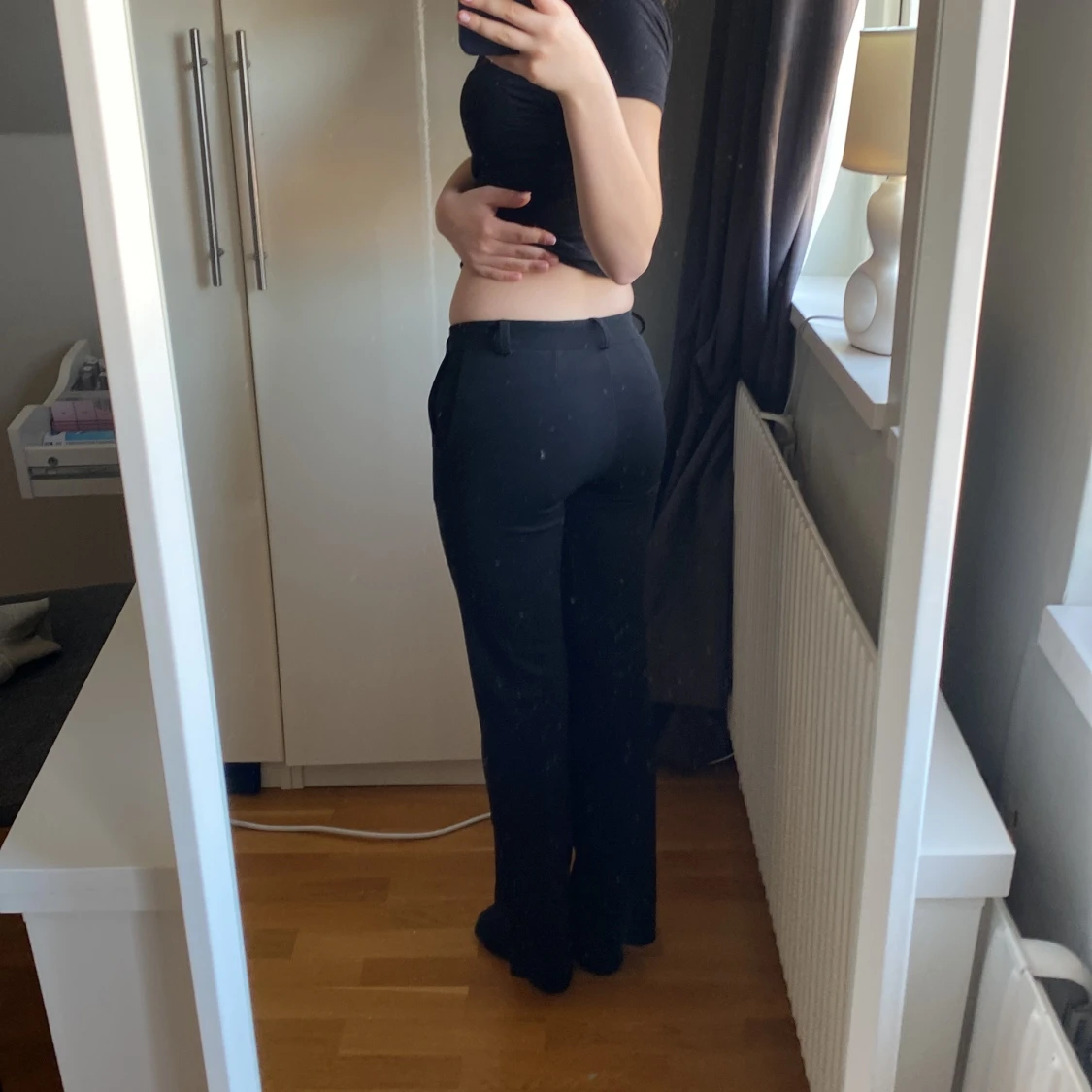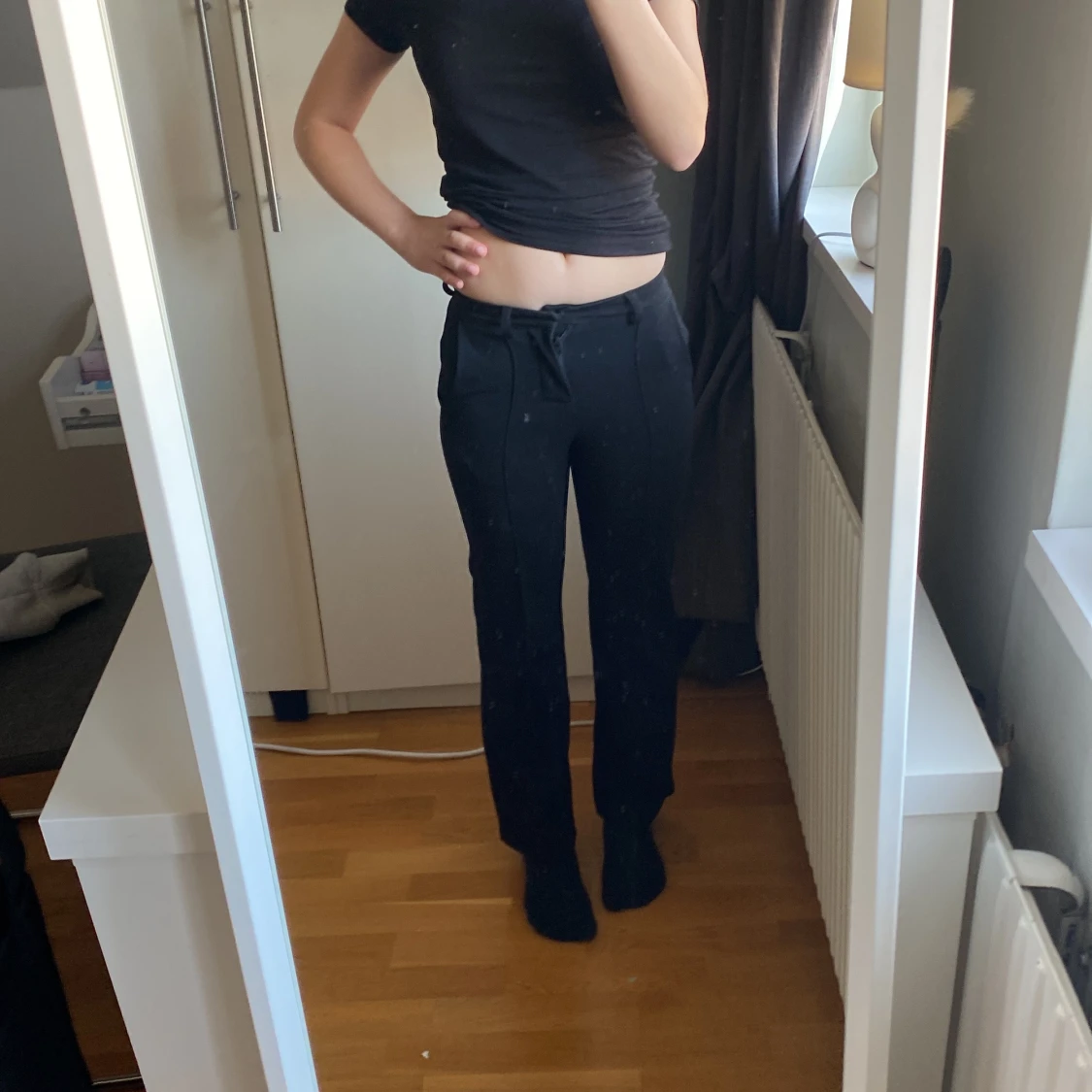Snygga svarta byxor med dragsko i midjan. De har en rak passform och är perfekta för en avslappnad stil. Byxorna är tillverkade i ett mjukt material som ger en bekväm känsla hela dagen.