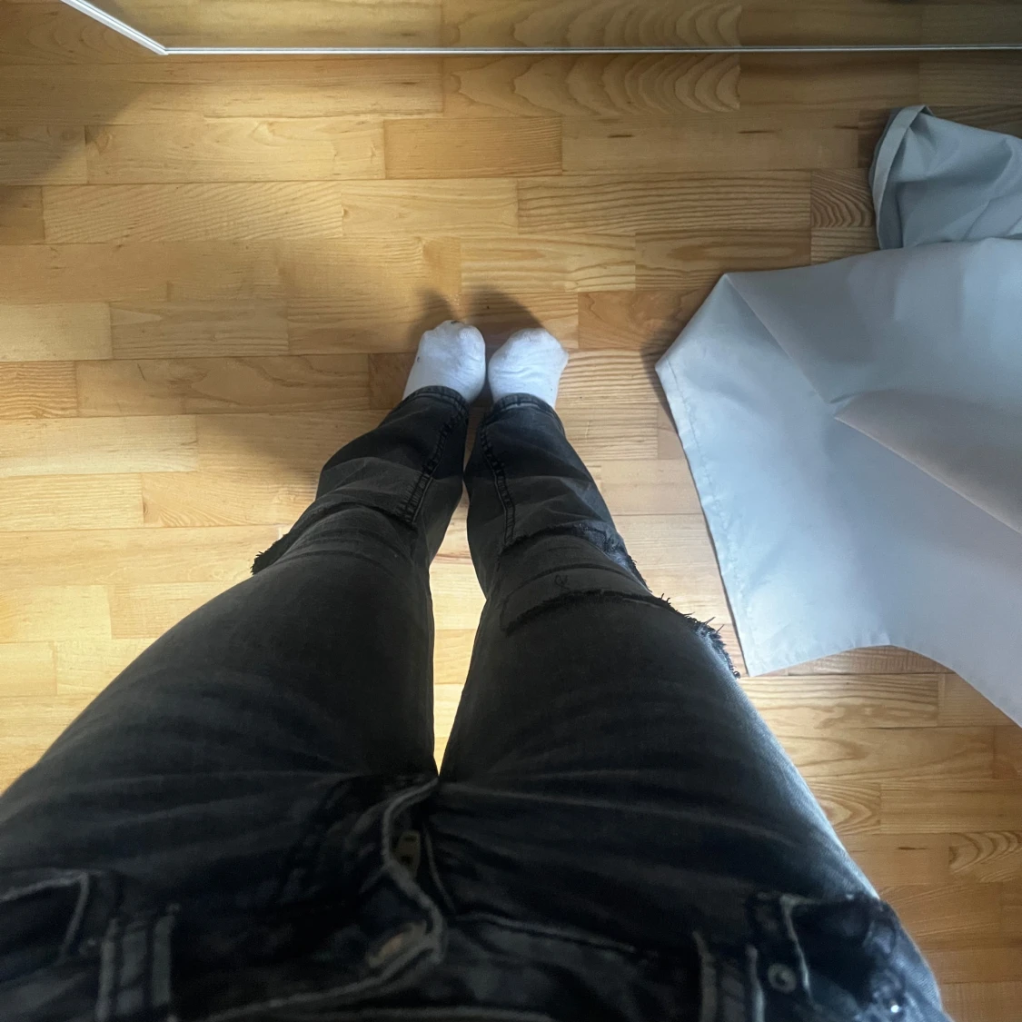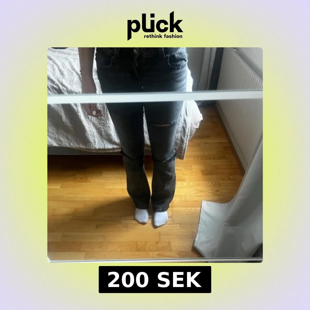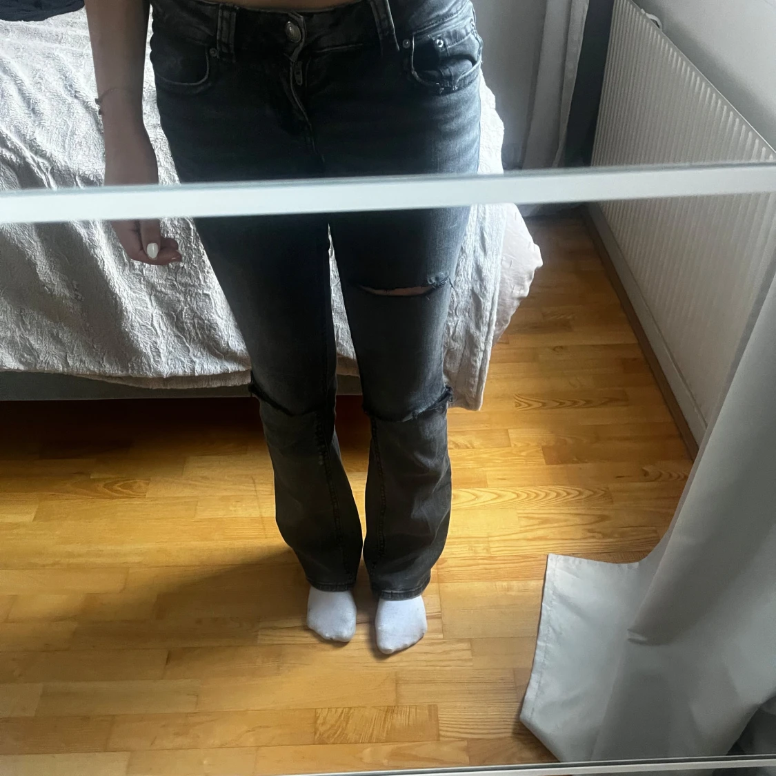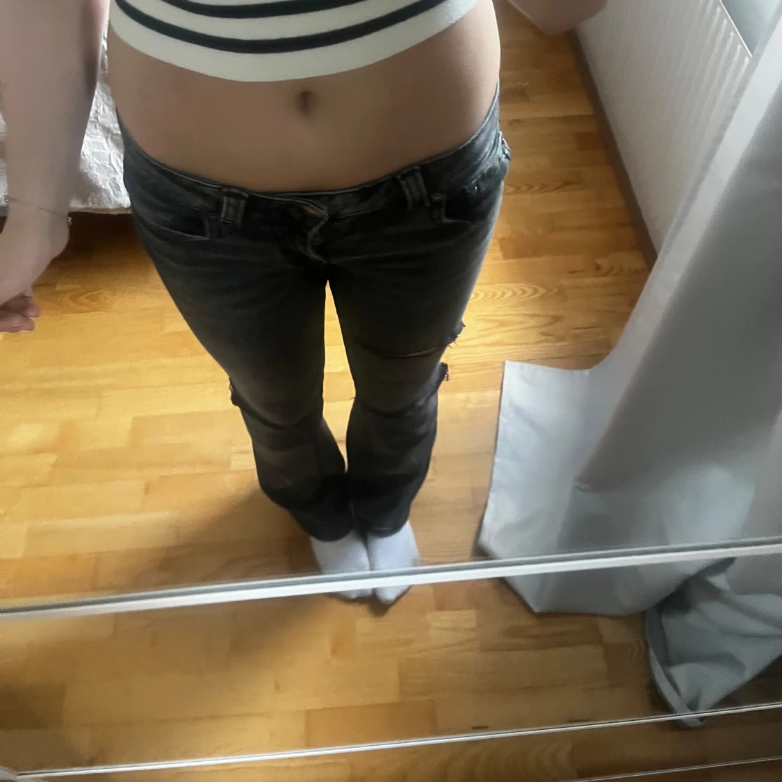 Säljer ett par svarta bootcut jeans med slitning över knät. Jeansen har låg midja och klassisk femficksmodell. Materialet är denim och passformen är normal med lätt utsvängda ben. Perfekta för dig som gillar en avslappnad och trendig look.