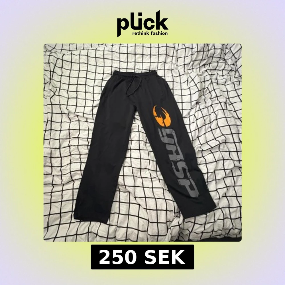 Svarta gymbyxor från GASP med stor logga i grått och orange på ena benet. Byxorna har resår och snörning i midjan för skön passform. Perfekta för gymmet eller chill hemma. Raka ben och mjukt material. Säljer för dom är för små! Storlek S