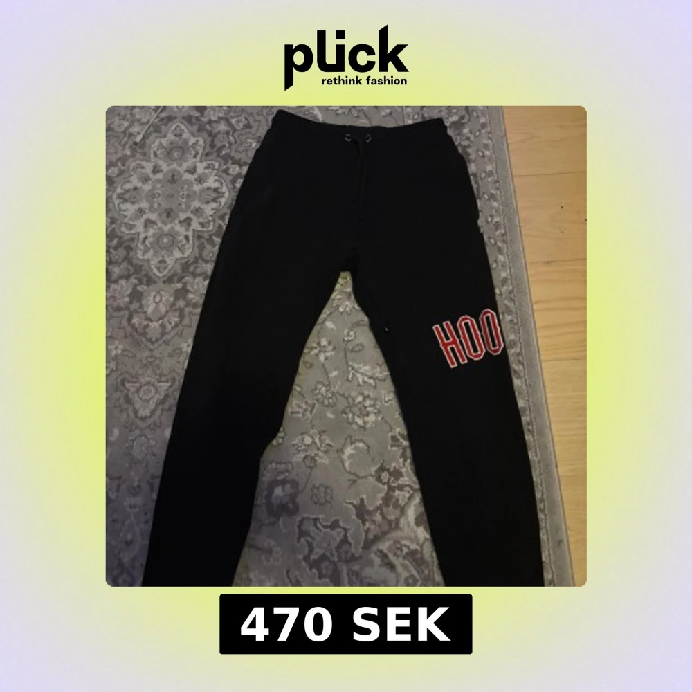 Svarta mjukisbyxor med snörning i midjan och tryck i rött och vitt på ena benet där det står 'HOODRICH'. Byxorna har även en vit signatur på andra benet. Perfekta för en avslappnad stil. Bra sick storlek XS