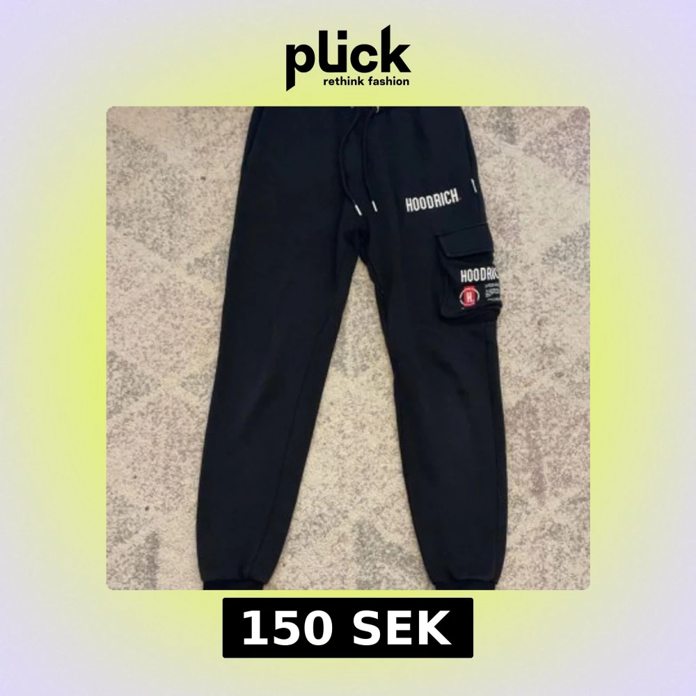 Snygga och bekväma Hoodrich mjukisbyxor i storlek XS. Fint skick, bara använt några gånger. Svarta med logga på benet och ficka på sidan. Passar både killar och tjejer.