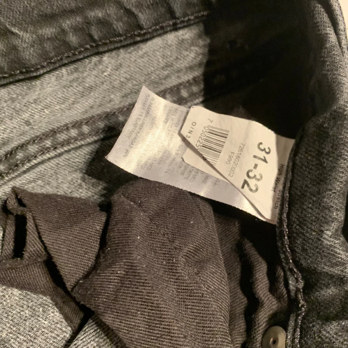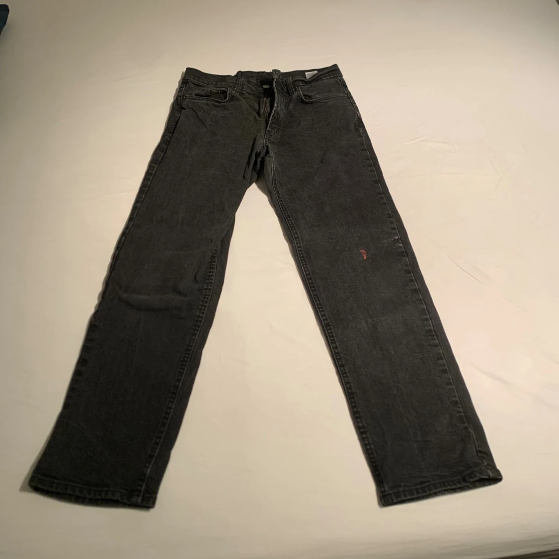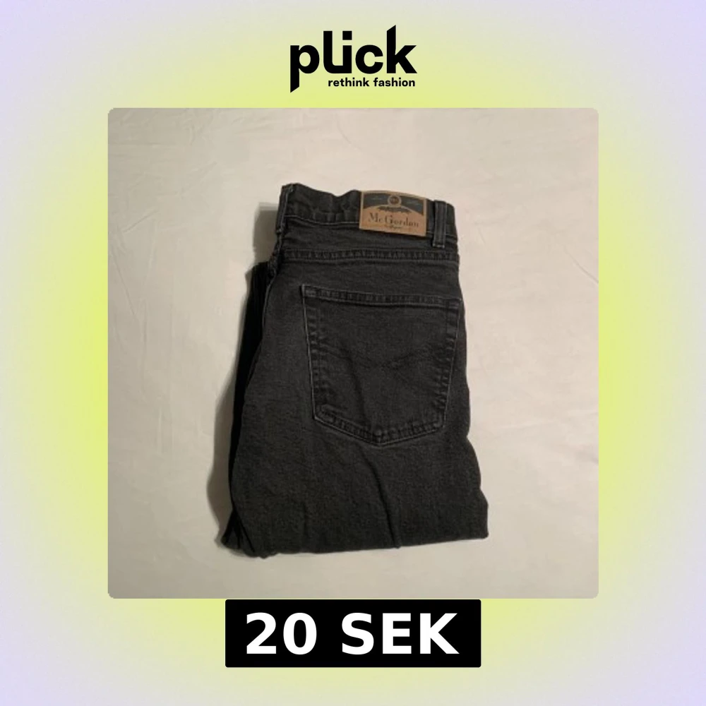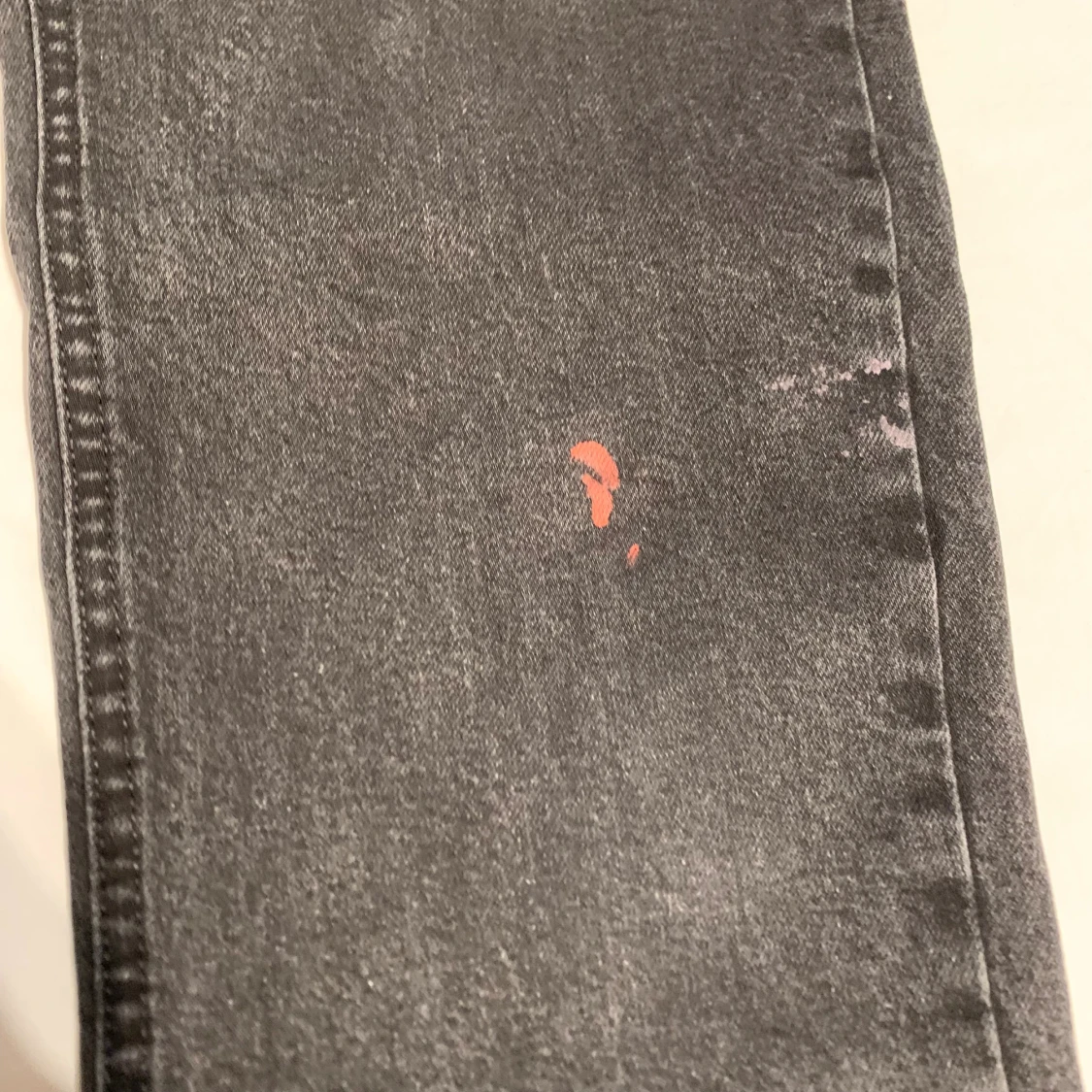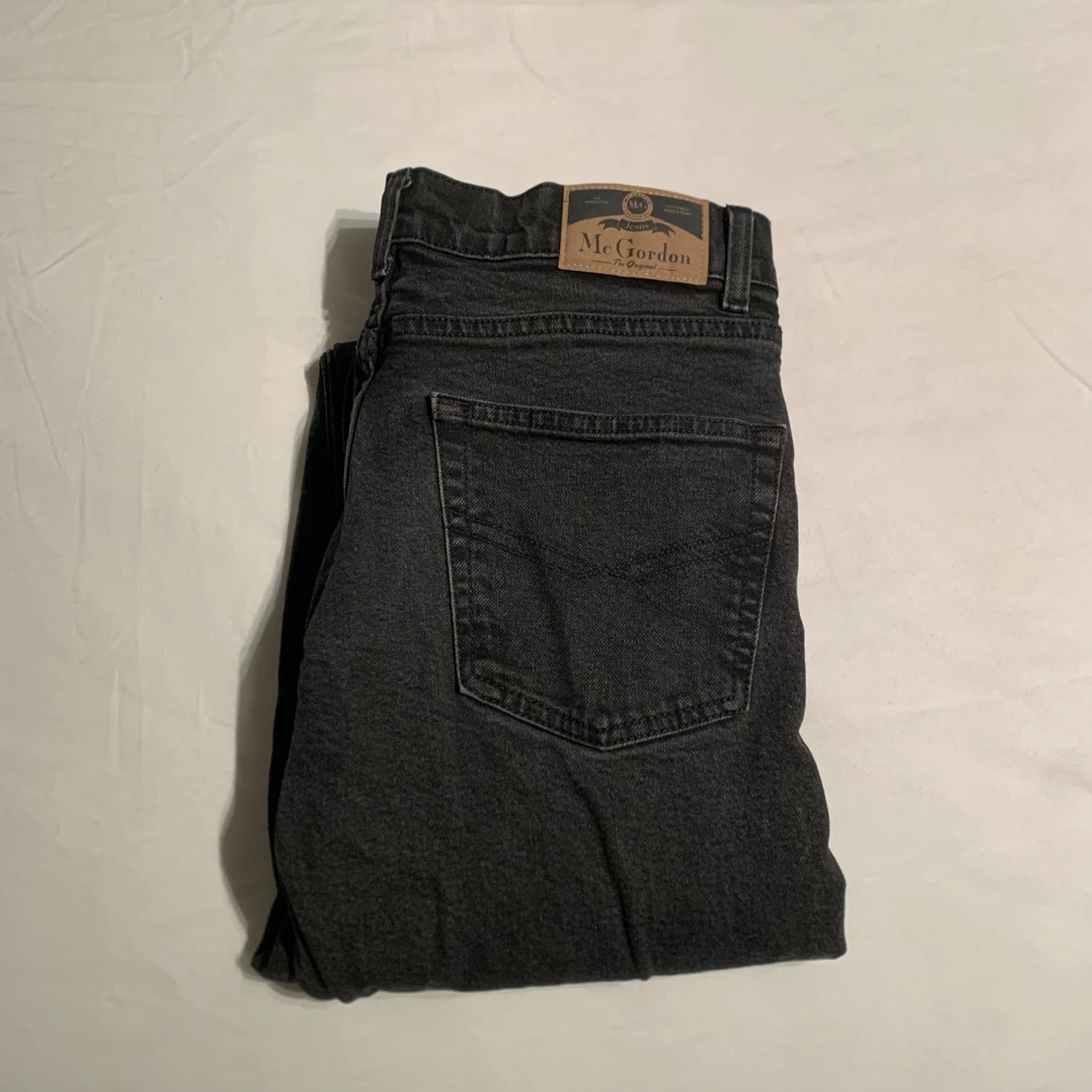 Svarta jeans från McGordon i klassisk rak modell med fem fickor och knappgylf. Jeansen har en diskret tvättad look och en liten röd färgfläck på ena benet. Passar dig som gillar enkel stil med lite edge.