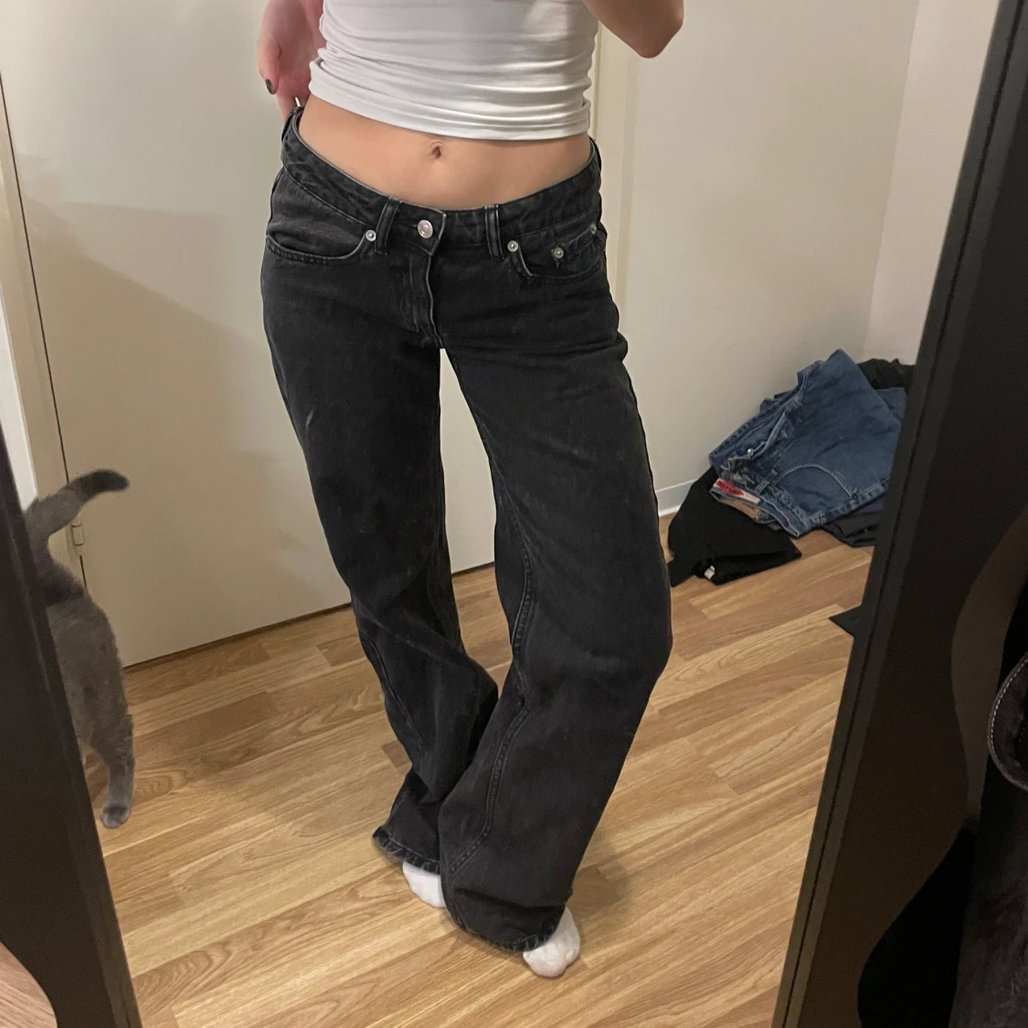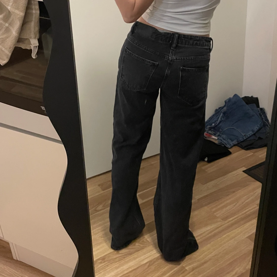Snygga svarta jeans från 157 i modellen Low Rider. De har en låg midja och en straight passform som ger en avslappnad look. Perfekta för en casual stil. Jag är 160cm. Dessa passar en som är runt 170 utan klackar