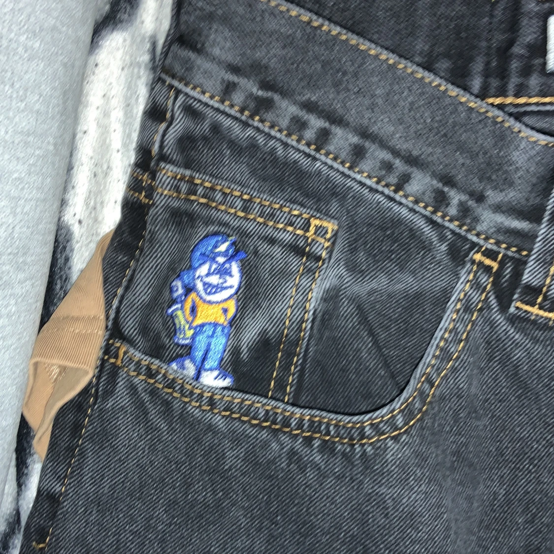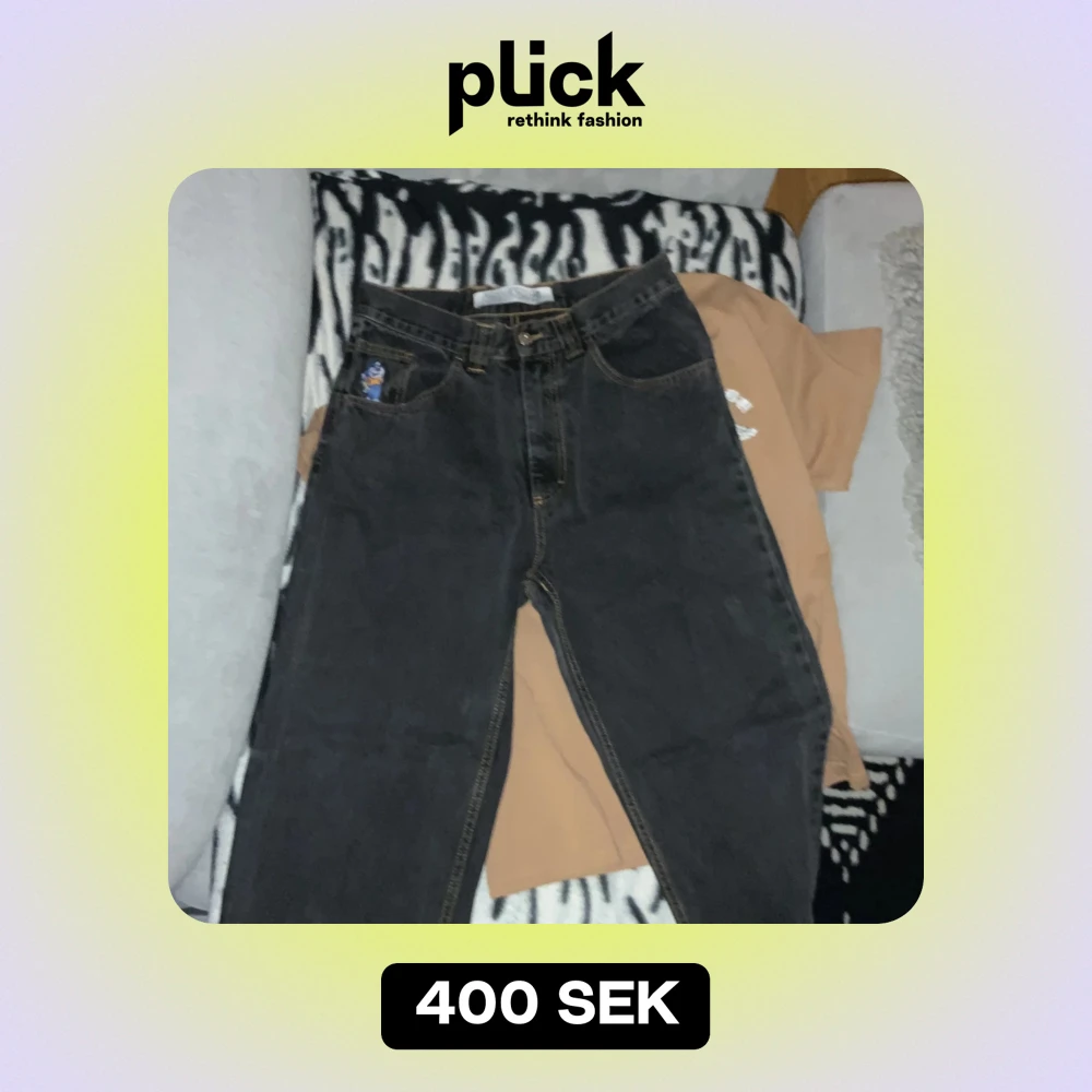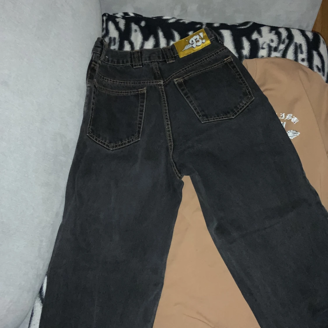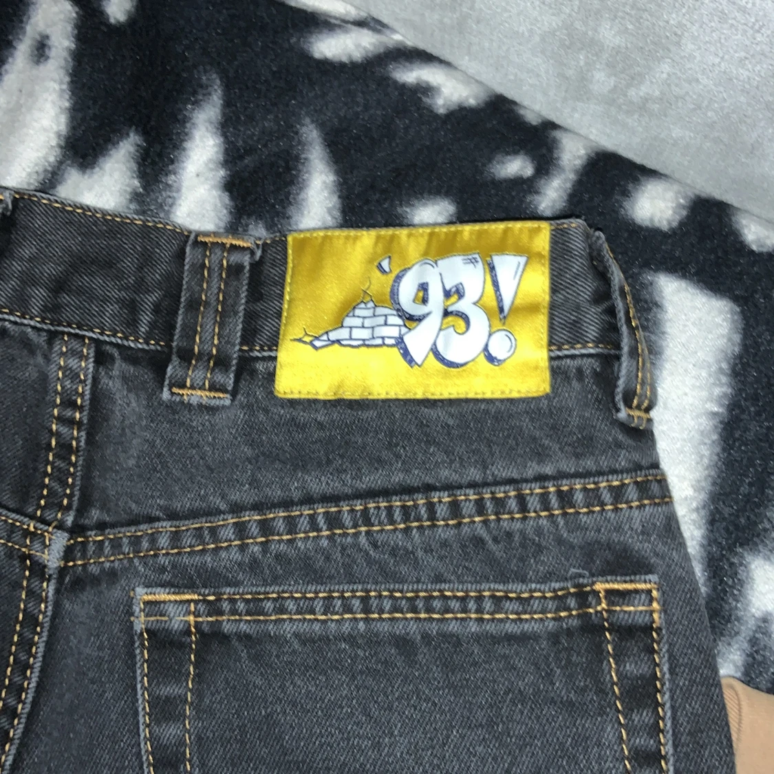 Säljer ett par svarta jeans från 93 Denim i bra skick. De har en cool broderad detalj på fickan och en gul etikett med '93!' på baksidan. Jeansen har en klassisk femficksdesign och stängs med dragkedja och knapp. Perfekta för en avslappnad stil!