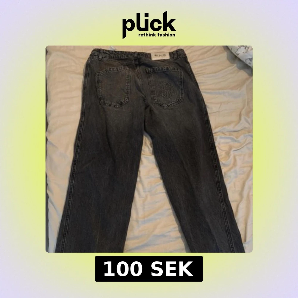 Säljer ett par svarta jeans från Black Squad med broderad detalj på bakfickan. Jeansen har klassisk femficksdesign, raka ben och dragkedja framtill. Materialet är jeans och färgen är tvättad svart med en lite sliten look. Perfekta för en avslappnad streetstil.