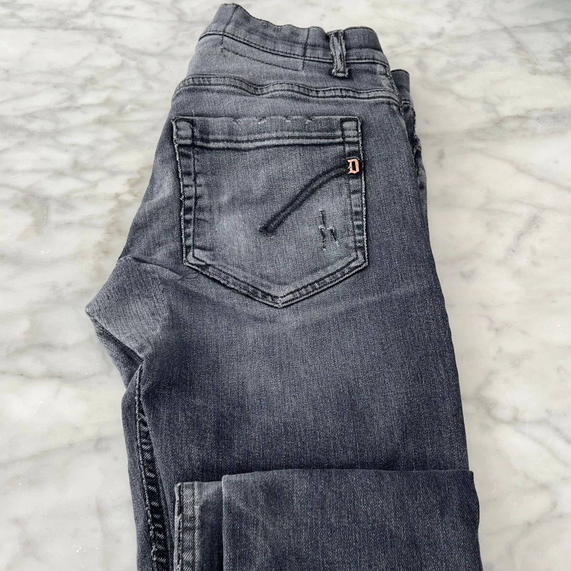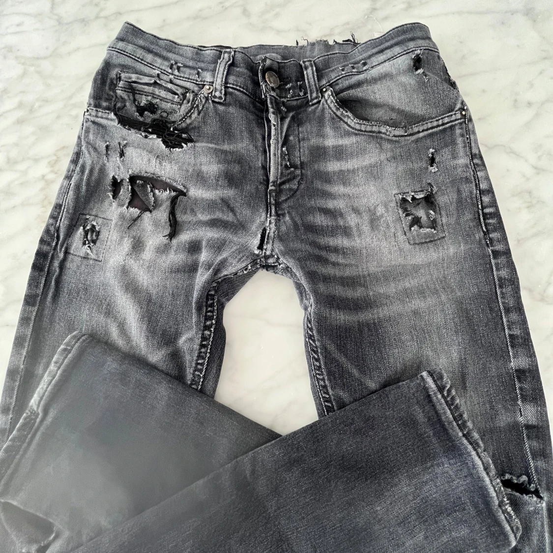 Tjena dessa jeans är från dondup och passar perfekt för dig som vill ha lite klass i din stil. Dem har lite slitningar runt benen och är lite mörk grå.