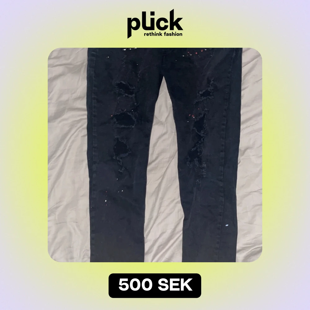 Säljer ett par svarta jeans från Dsquared2 i bra skick. De har en cool distressed look med slitningar och färgstänk. Tillverkade i Italien av 98% bomull och 2% elastan för en bekväm passform. Perfekta för en avslappnad och trendig stil!