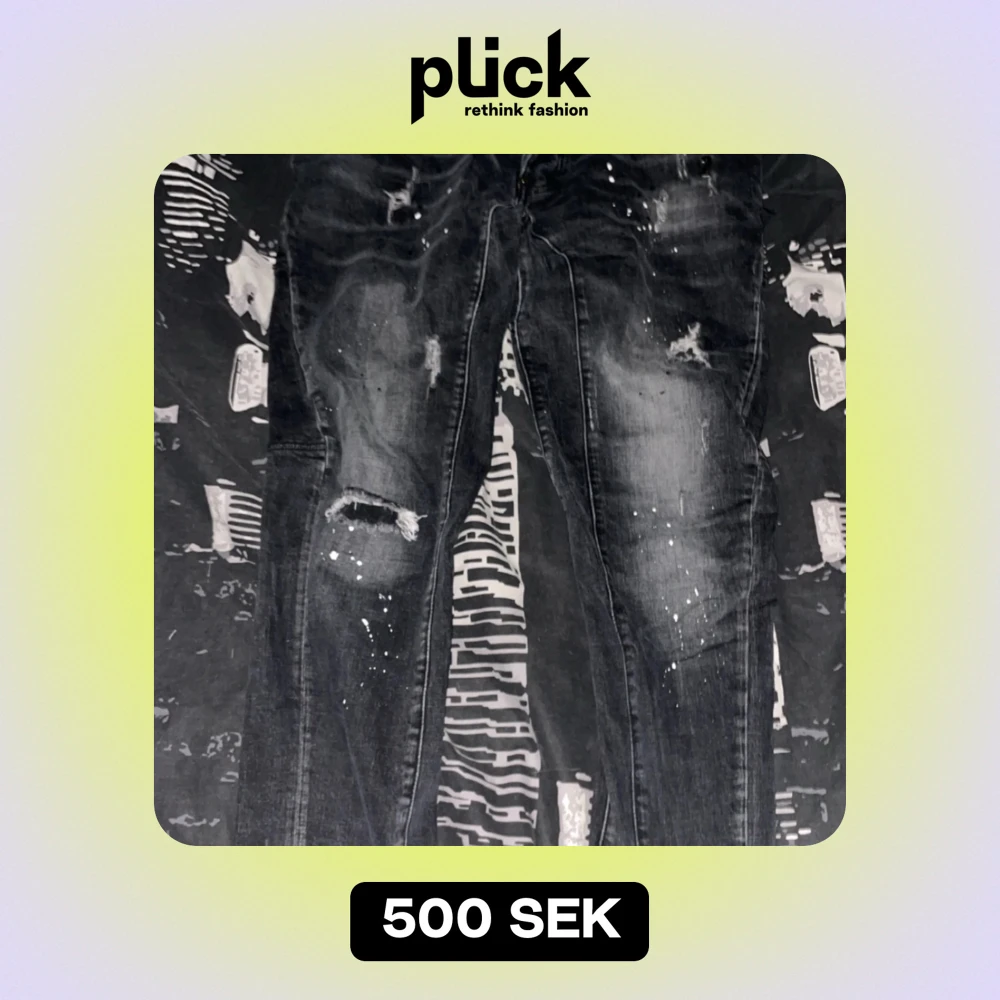 Säljer ett par svarta jeans från Dsquared2 i bra skick. De har en cool slitning och färgstänk som ger en edgy look. Jeansen är skinny fit och har knappar med Dsquared2-logga. Perfekta för en avslappnad men stilren outfit!