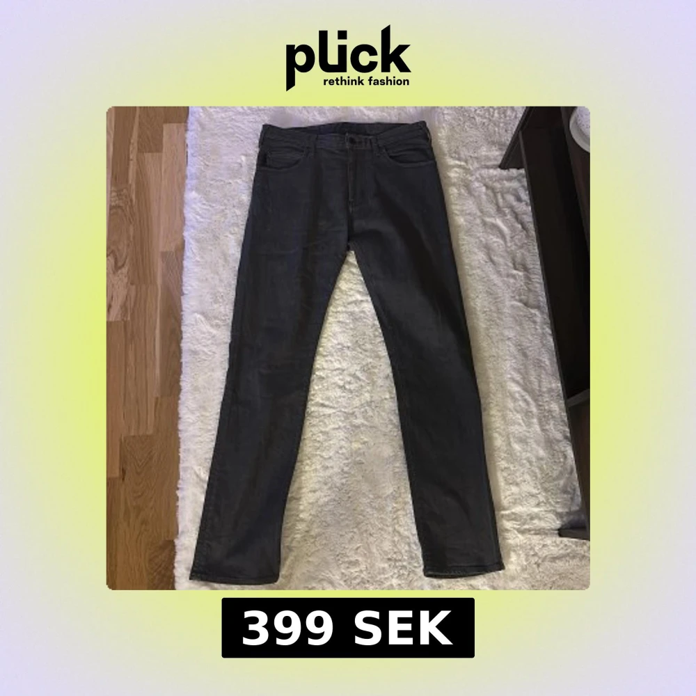 Säljer ett par svarta jeans från Emporio Armani. Byxorna har klassisk femficksdesign, normal passform och raka ben. Tillverkade i bomull och passar perfekt till dig som gillar stilrena och tidlösa jeans.