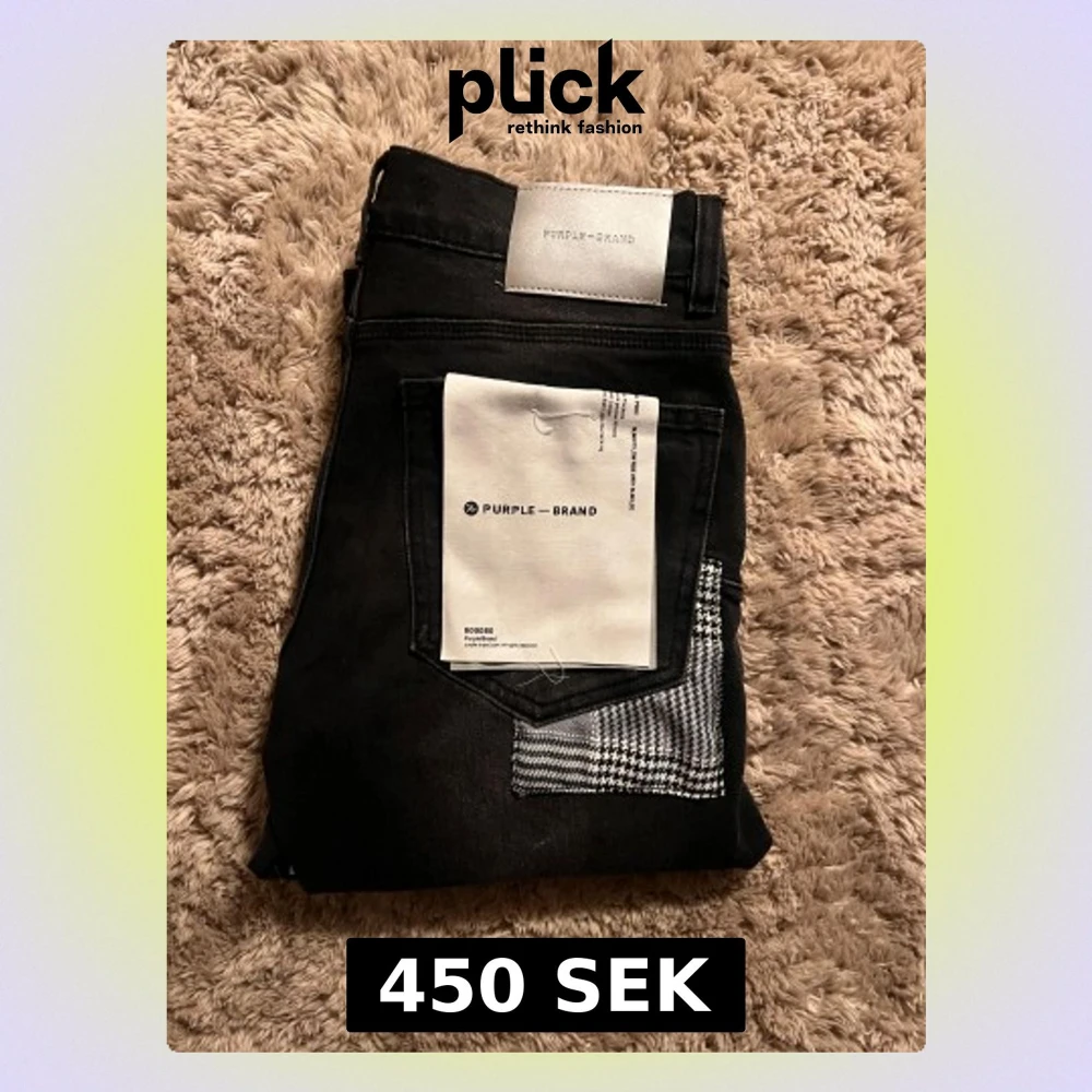 Svarta jeans från Purple Brand med slim fit passform och slitna detaljer på benen. Baksidan har en unik rutig patch på fickan och silverfärgad logotyp på linningen. Jeansen är gjorda i stretchigt bomullsmaterial och har klassisk femficksdesign. (Pris går att diskuteras)