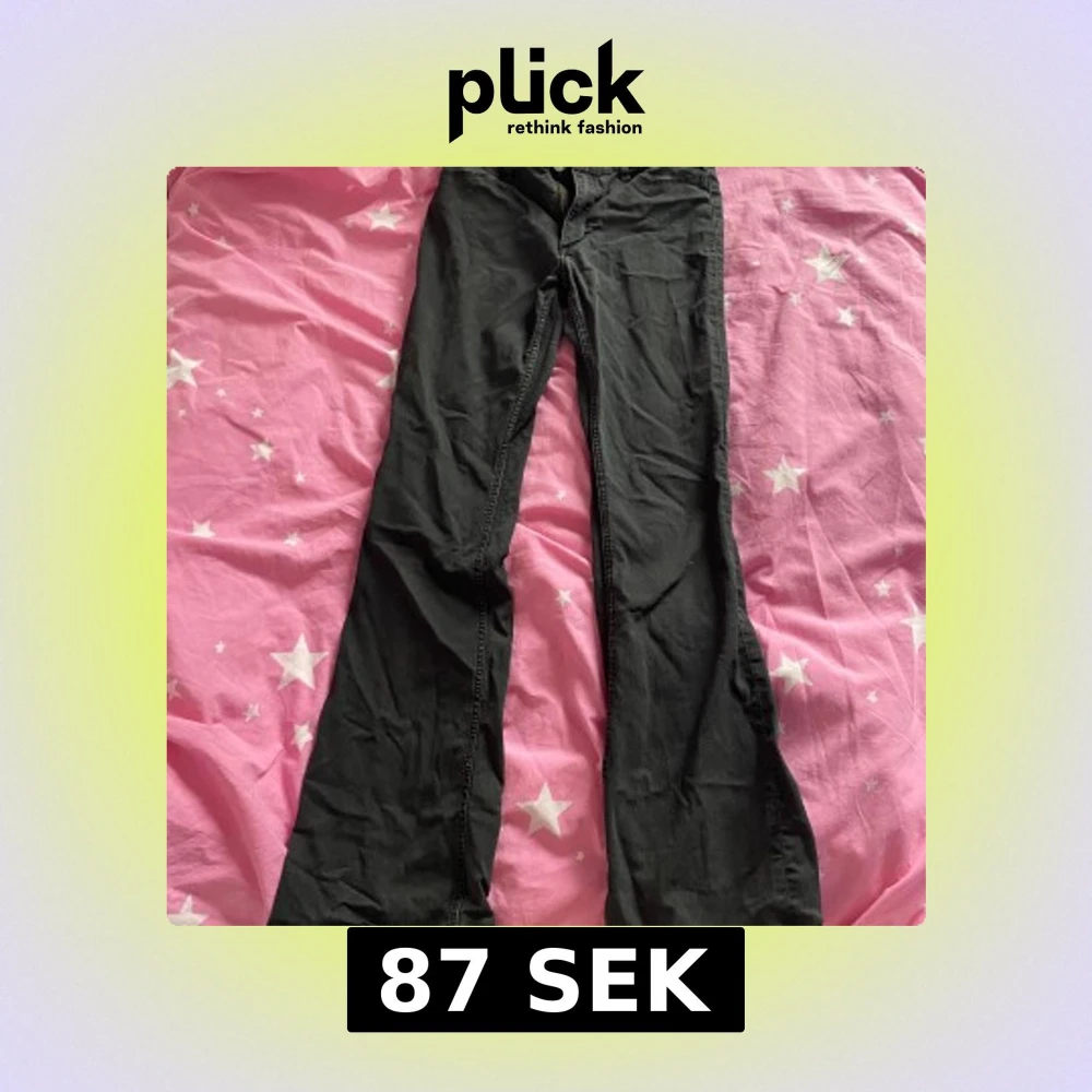 Säljer ett par svarta flare jeans från H&M i storlek 164. Byxorna har låg midja och utsvängda ben, sitter snyggt över höften och låren. Klassisk femficksmodell med knapp och dragkedja. Perfekta om du gillar en trendig siluett!