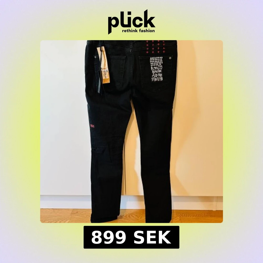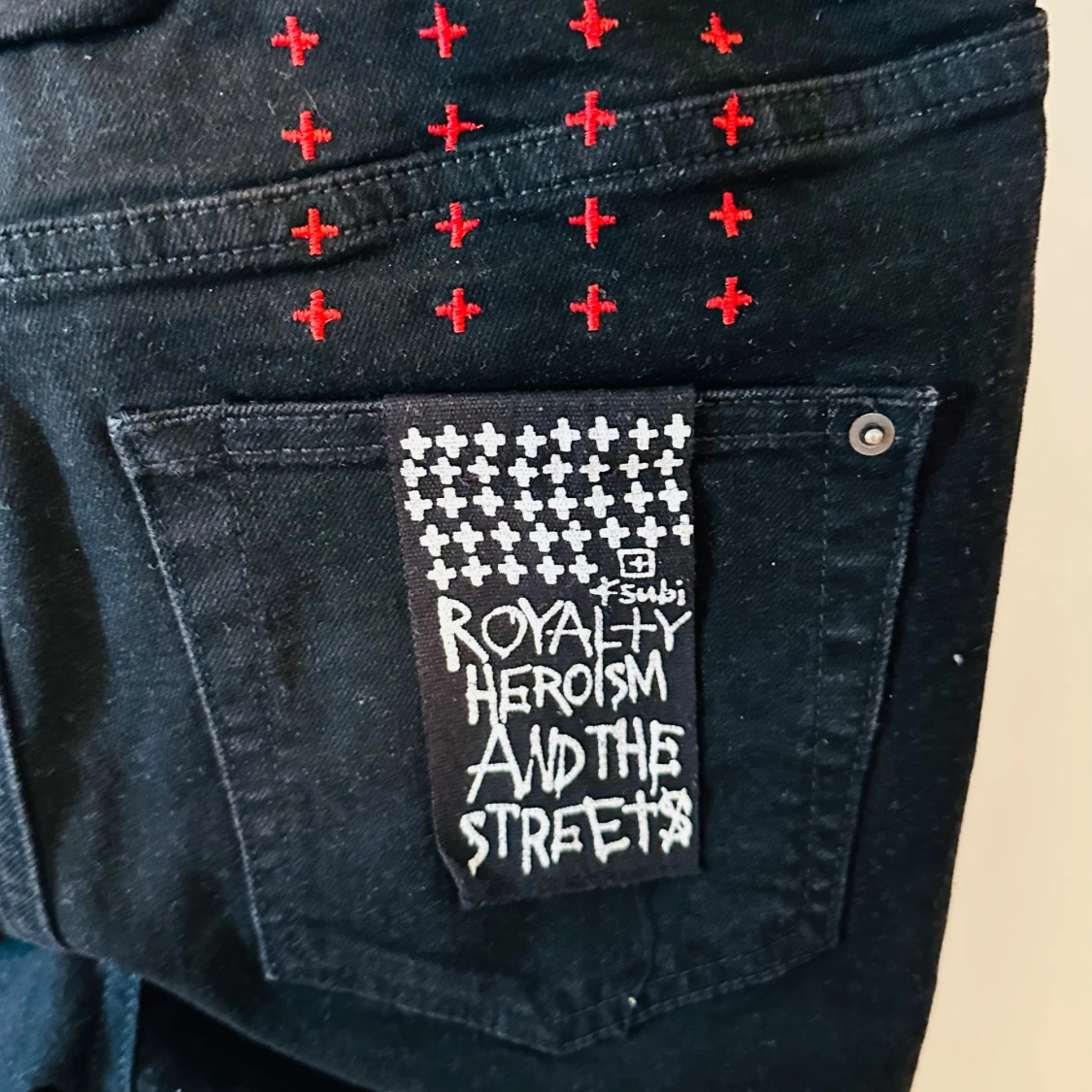 Svarta jeans från Ksubi, modell Chitch Laid Black. Snygga broderade röd plus på bakfickan och patch med texten 'Royalty Heroism And The Streets'. Klassisk femficksmodell med rak passform och unika detaljer.