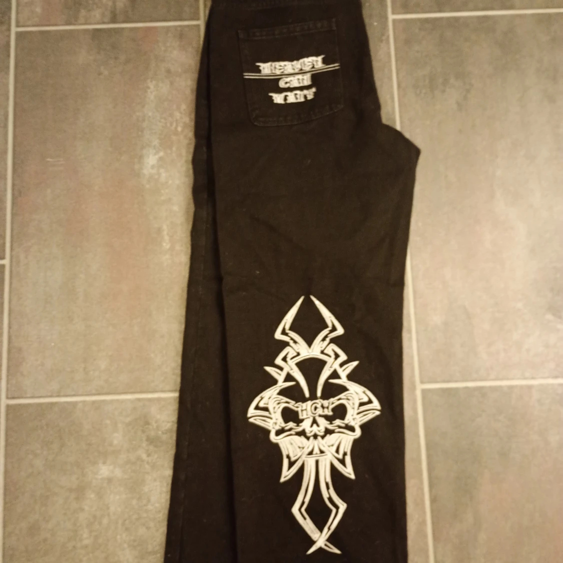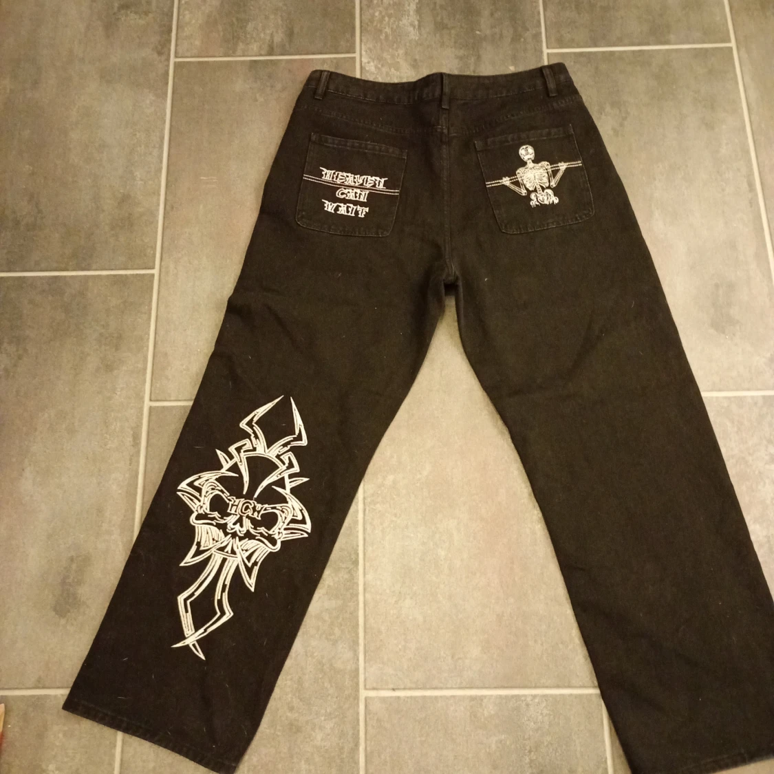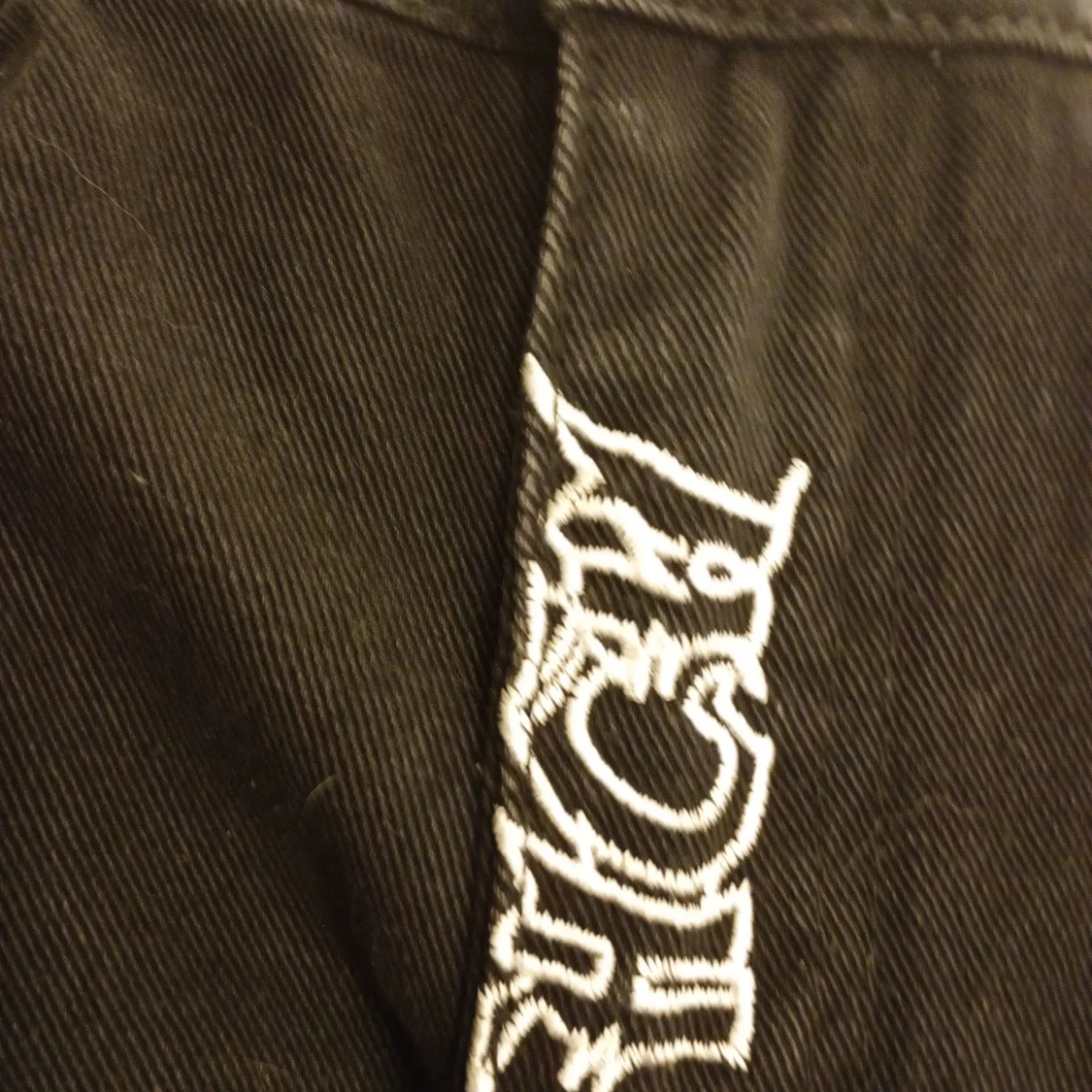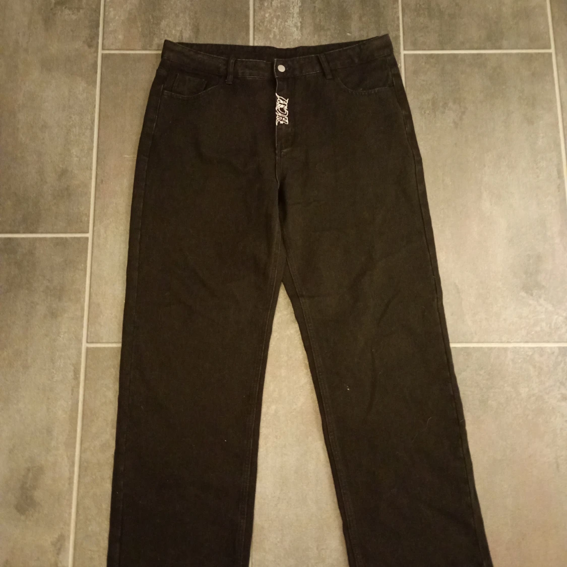 Coola svarta jeans med unikt vitt broderi på benet och bakfickan. De har en rak passform och är perfekta för en edgy stil. Broderiet ger en extra touch av personlighet.