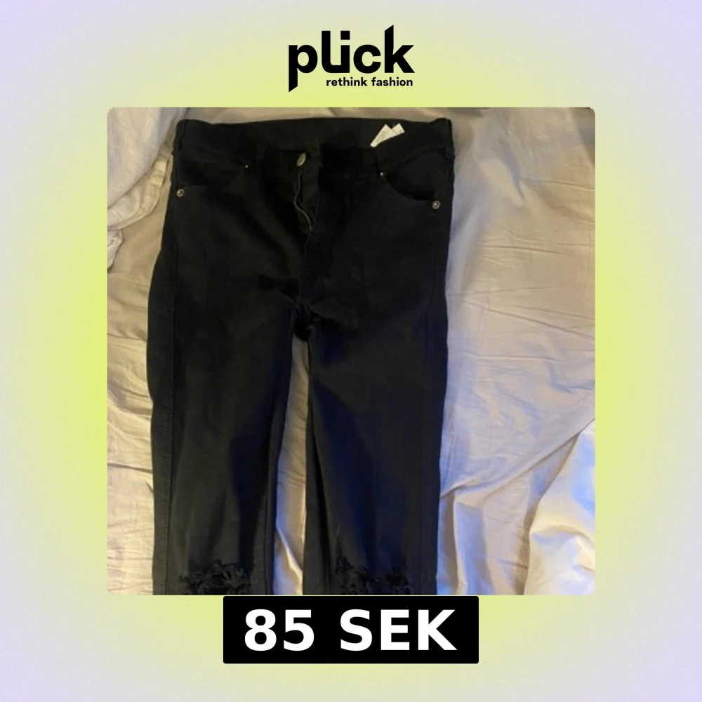 Svarta jeans med raka ben och slitna hål på båda knäna. Klassisk femficksmodell med knapp och dragkedja i midjan. Perfekta för en avslappnad och trendig look.