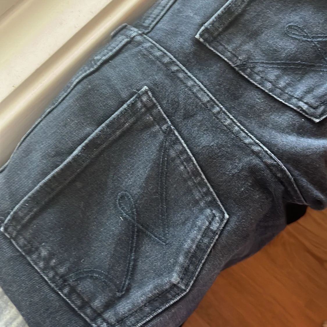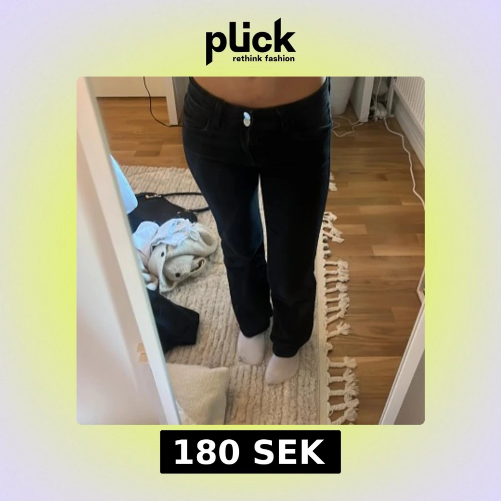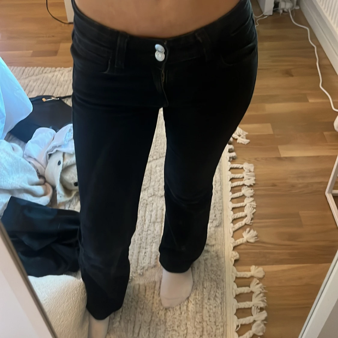 Snygga svarta jeans med låg midja, två knappar där fram. Fickorna har en snygg design där bak. Sitter super bra men är tyvärr för korta och därför säljer jag dom. Inga defekter. Jeansen är i storlek 146/152 från gina young.