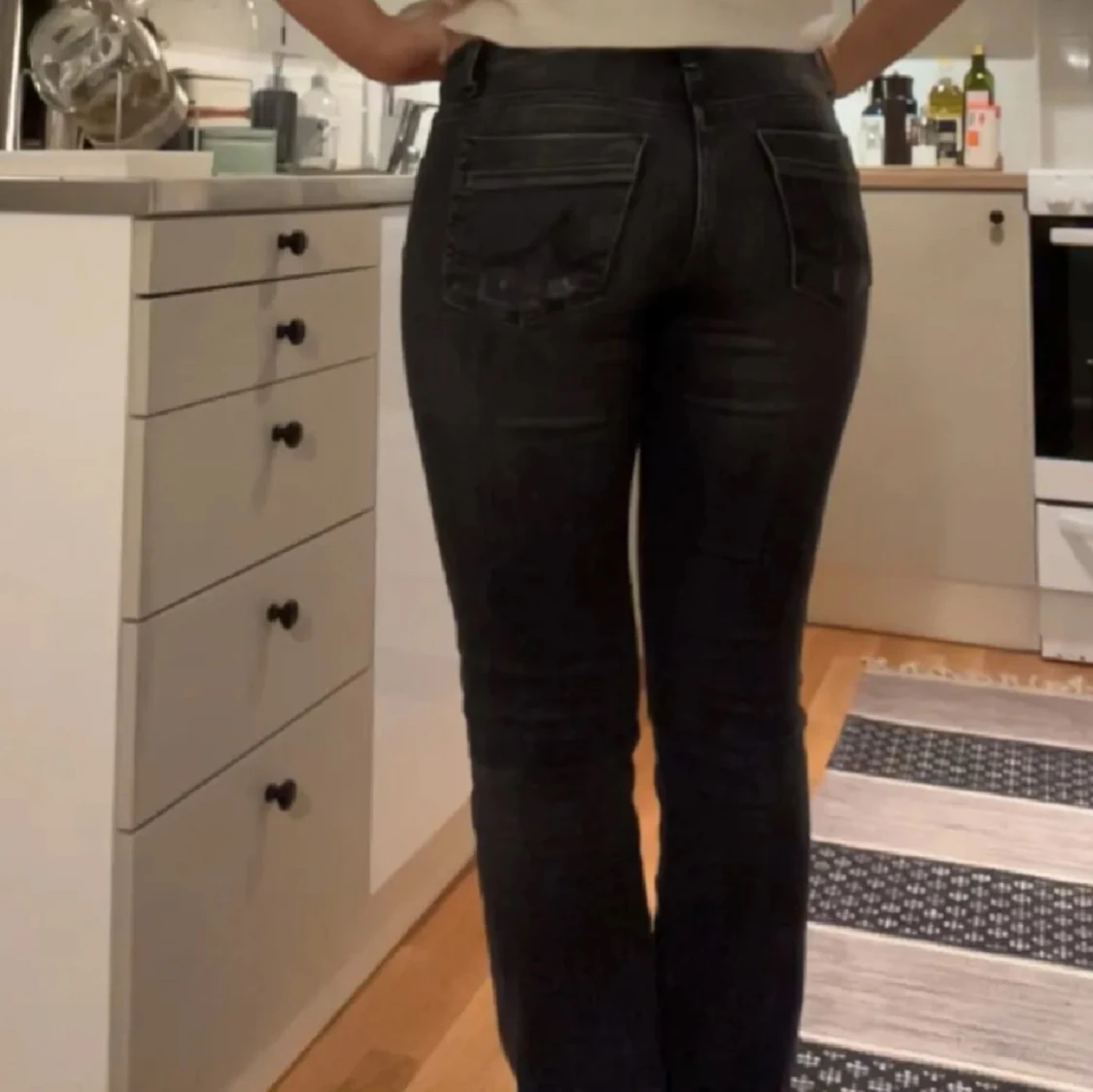Snygga svarta jeans med slitningar på knäna. Lånad bild, mina jeans är fortfarande hela vid slitningarna🥰 använt ett fåtal gånger!! Passar både xs och small. W27 L30