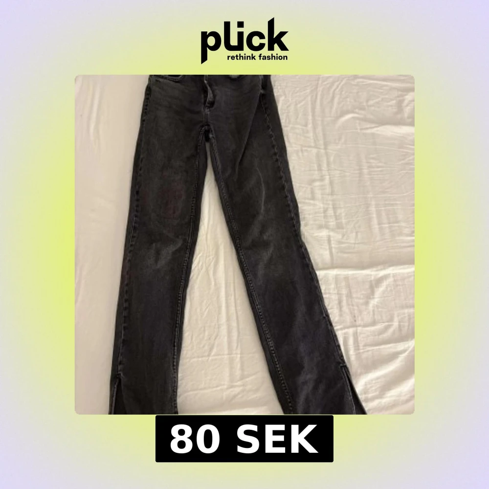 Säljer ett par svarta jeans med raka ben och slits nertill. Jeansen har klassisk femficksdesign och normal passform. Perfekta till vardags för en stilren look.