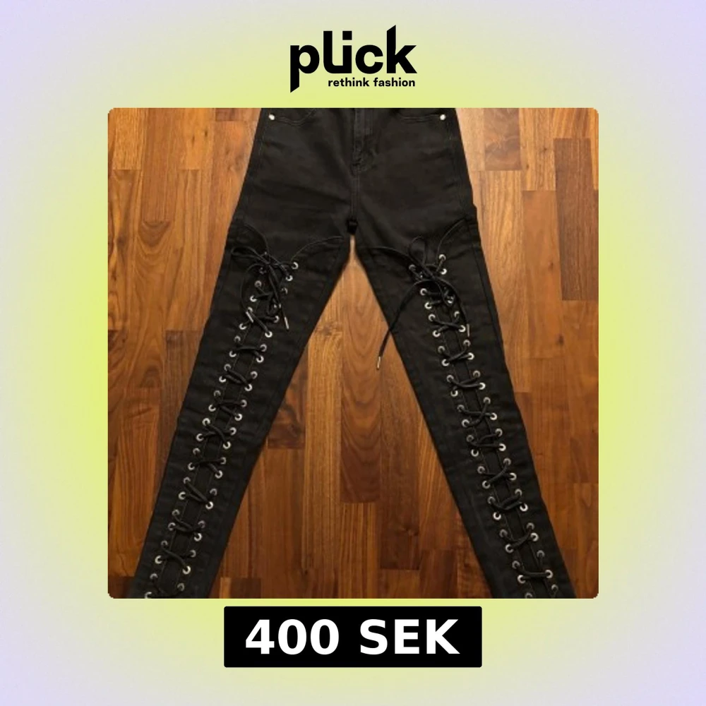 Svarta skinny jeans från Manière De Voir med cool snörningsdetalj längs hela framsidan av benen. Klassisk femficksmodell, hög midja och silverfärgade nitar. Jeansen är i stretchigt denim och har en edgy vibe som sticker ut.