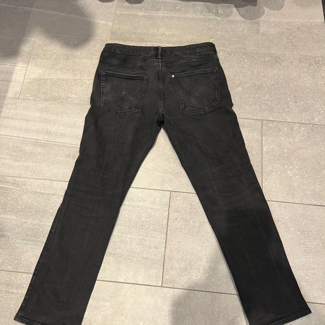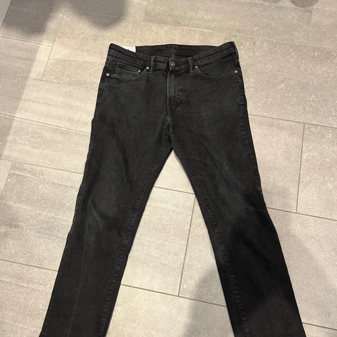 Säljer ett par svarta jeans från H&M i modellen Straight Regular fit. Klassisk femficksdesign med dragkedja och knapp framtill. Jeansen har raka ben och normal passform, perfekta till vardags.