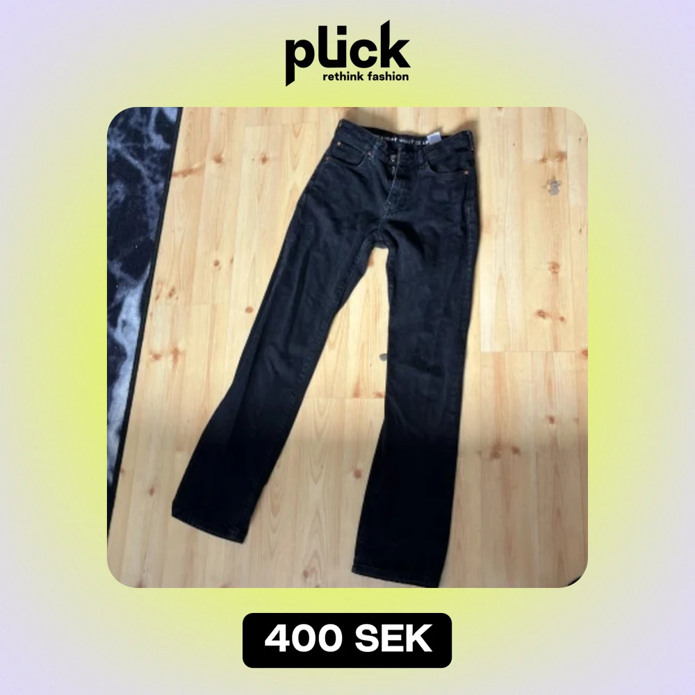 Svarta jeansbyxor med låg midja och rak passform. Byxorna har en dragkedja och knappar framtill samt fickor både fram och bak.