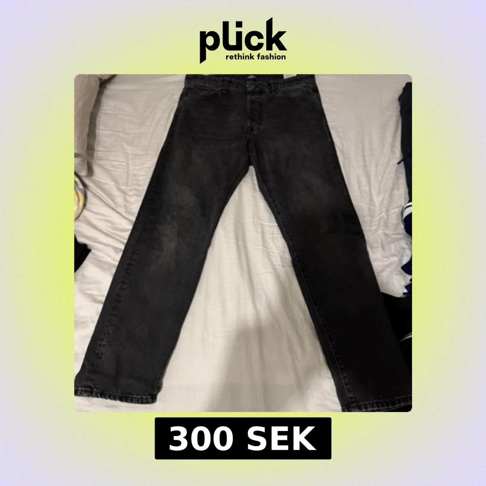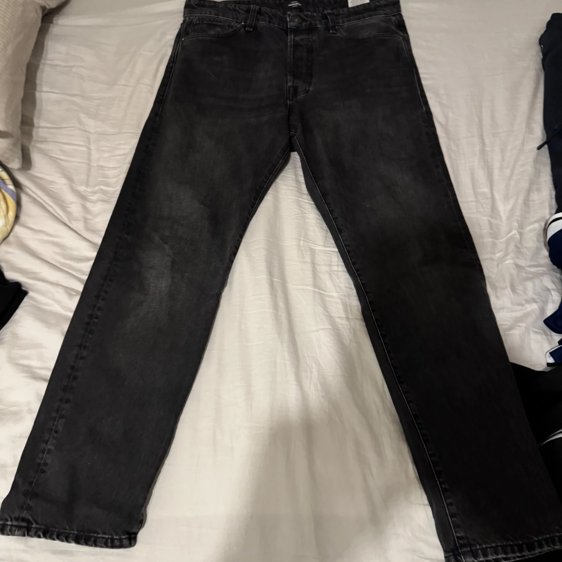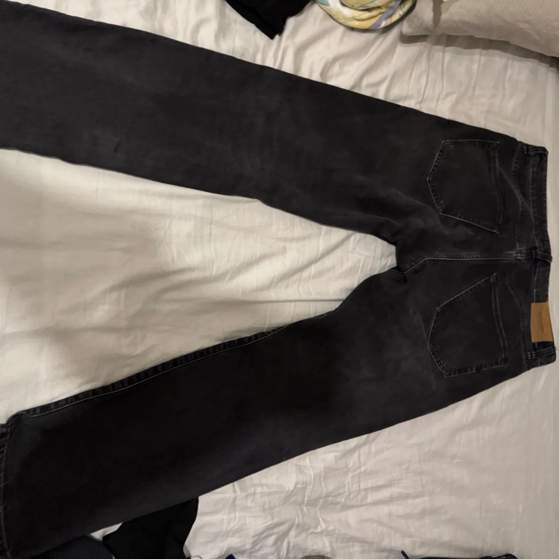 Snygga svarta jeansbyxor med en klassisk straight passform. De har en midwaist design och är perfekta för en avslappnad stil. Byxorna har traditionella fem fickor och en knappgylf. Storlek 33/32