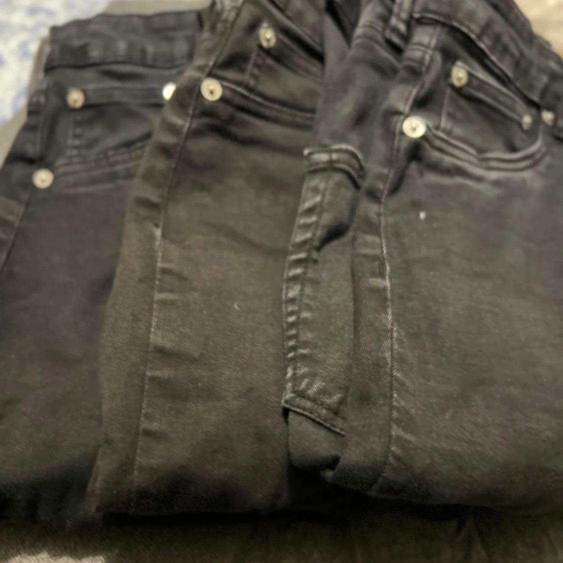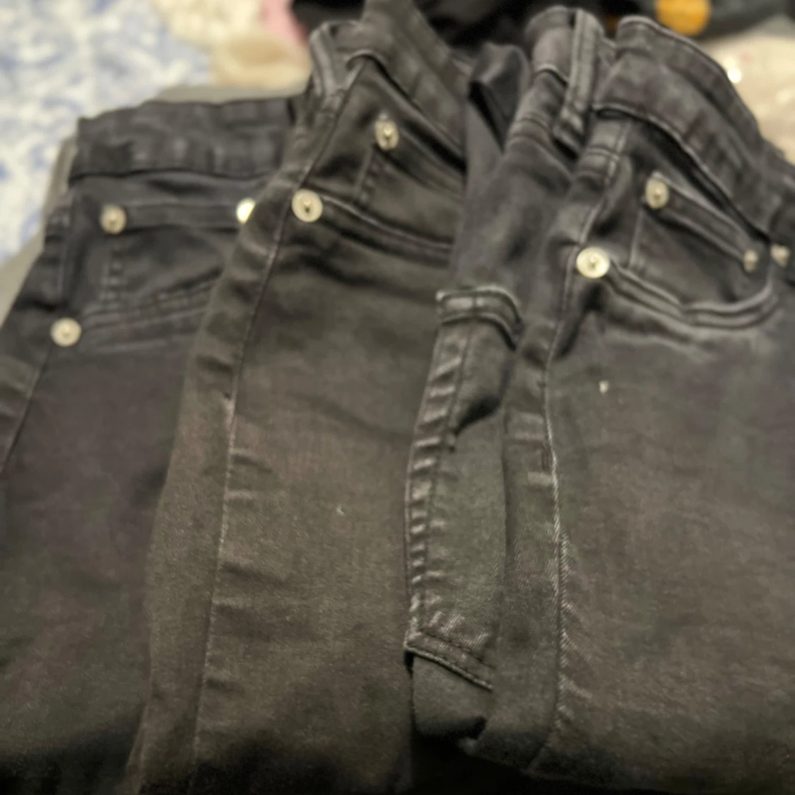 Snygga svarta jeansbyxor med klassisk femficksdesign och silverfärgade knappar. Märket snake Perfekta för en stilren look. Två st i storlek M och 1st i strl S