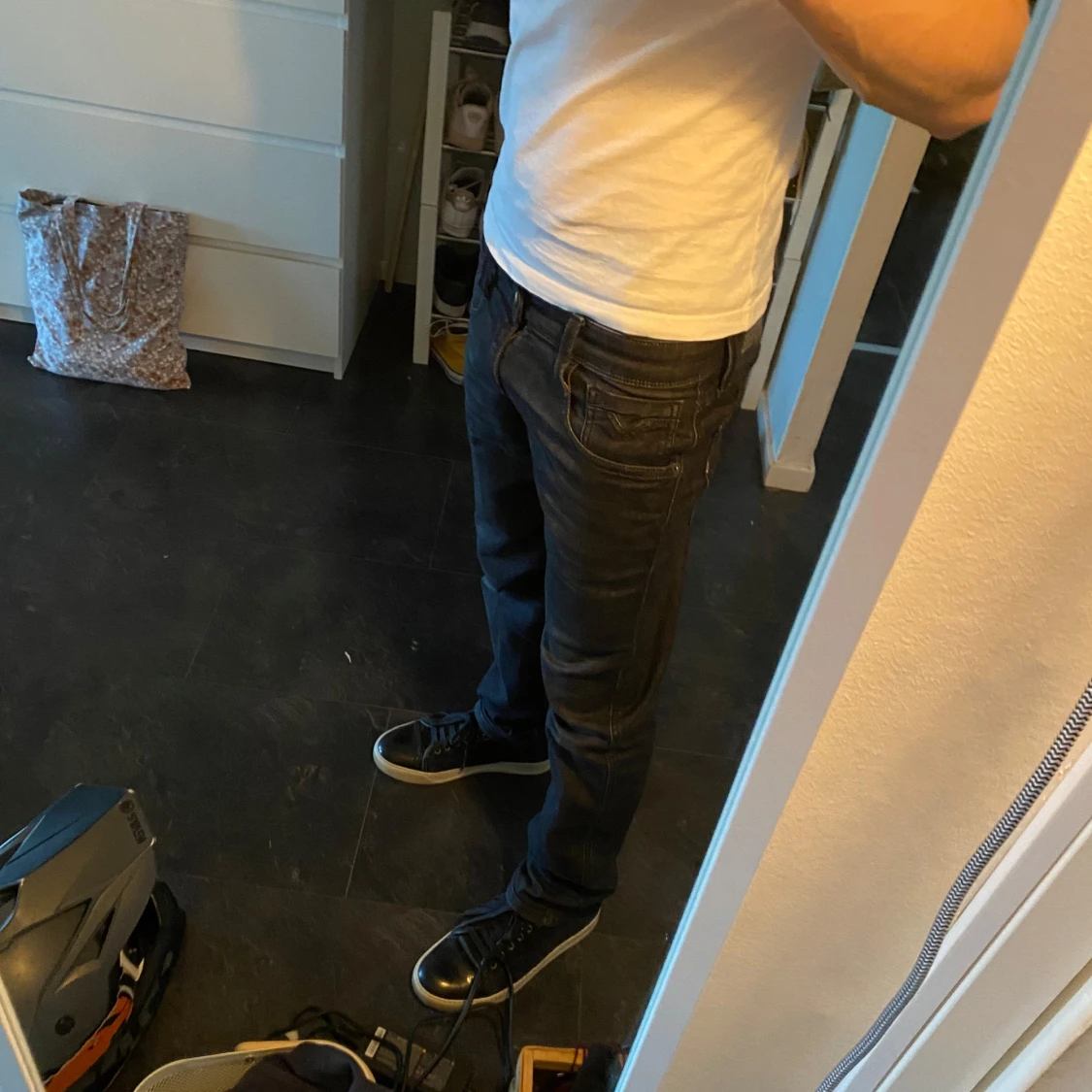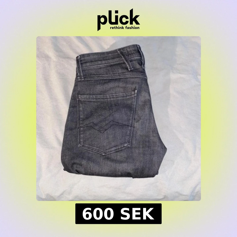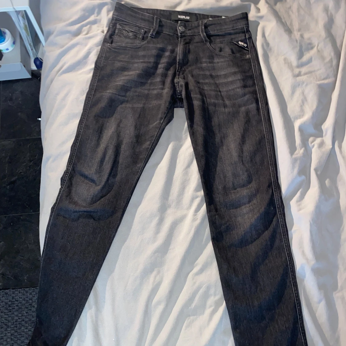 Säljer ett par svarta Replay jeans med klassisk femficksdesign och diskreta sömmar. Byxorna har slim-fit passform och raka ben, perfekt för en stilren look. Materialet är mjukt och stretchigt för extra komfort. 28w, 30l