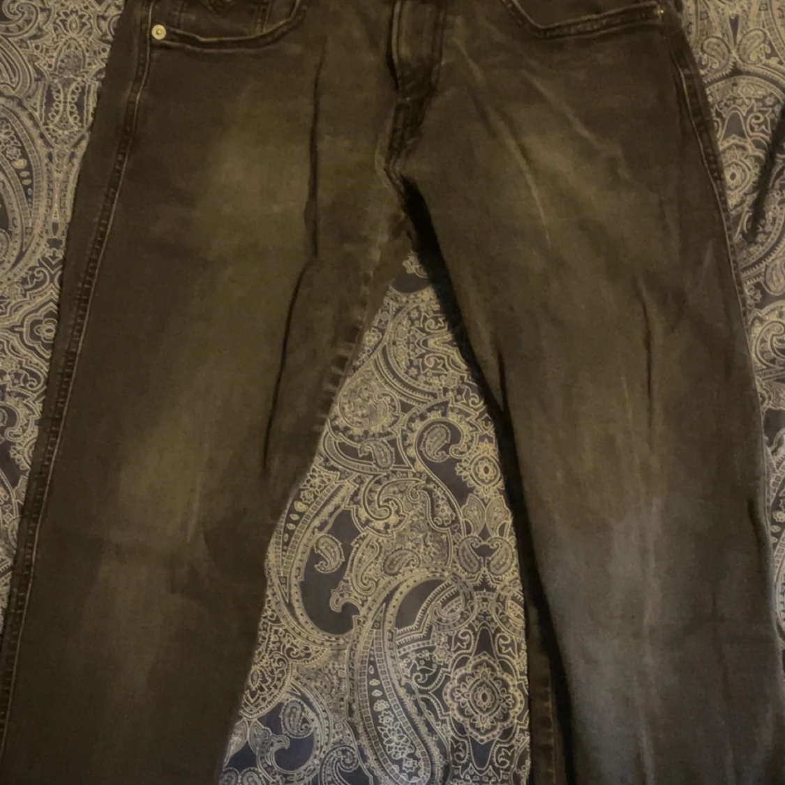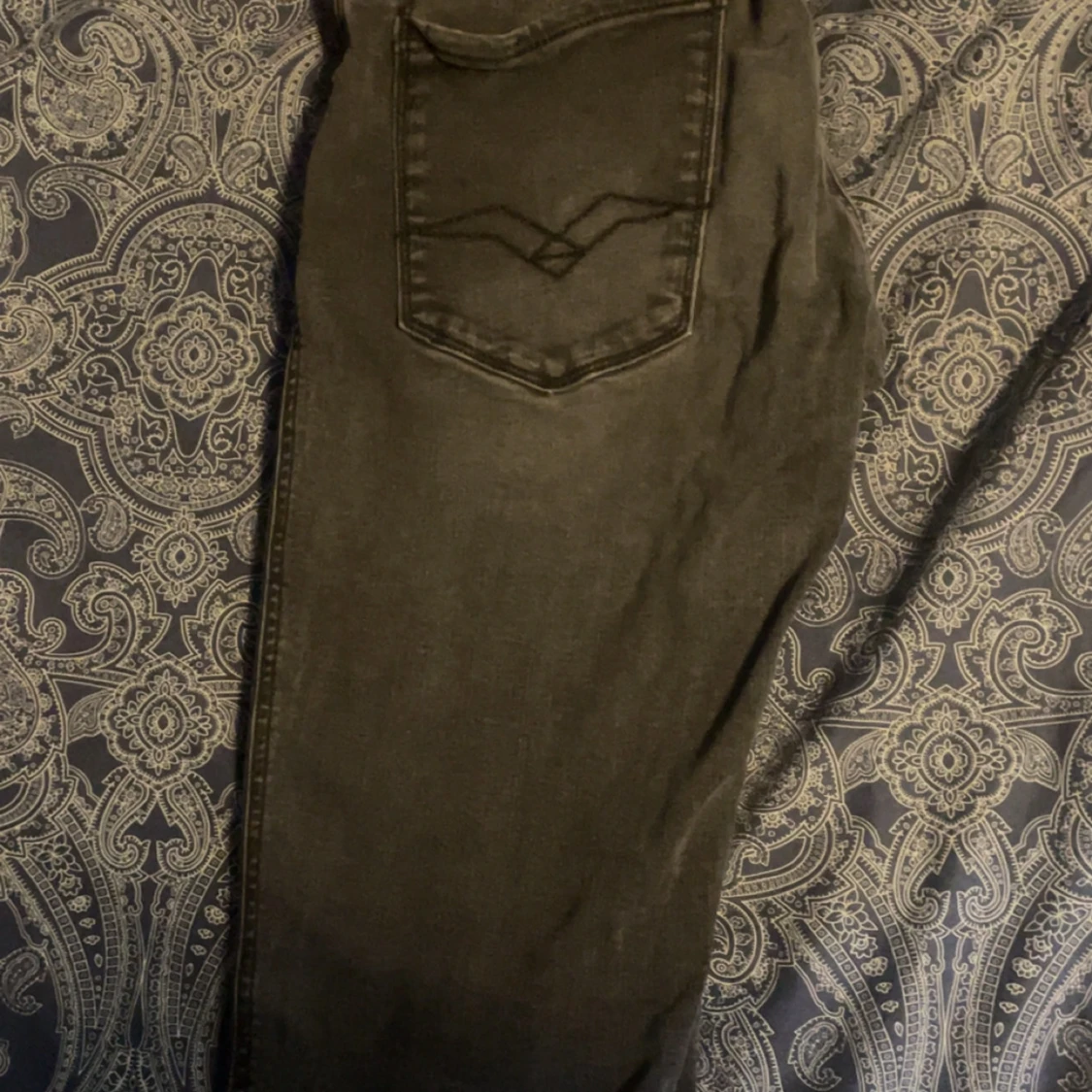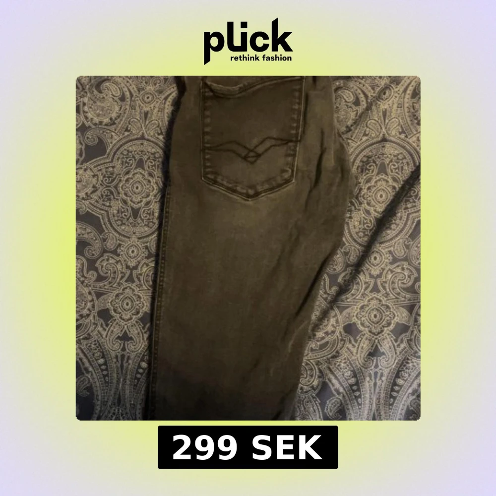 Säljer ett par svarta jeansbyxor från Replay med klassisk femficksdesign och diskret sliten look. Byxorna har raka ben och normal passform, perfekt till vardags. Snygga detaljer på bakfickan.