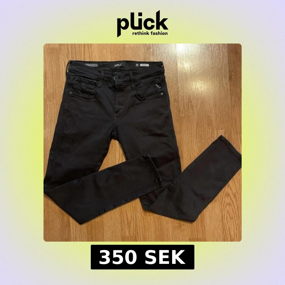 Snygga svarta jeansbyxor från Replay i modellen Anbass. De har en klassisk femficksdesign med knapp och dragkedja framtill. Perfekta för en stilren look. Lite slitna på vissa ställen. Storlek 29/30