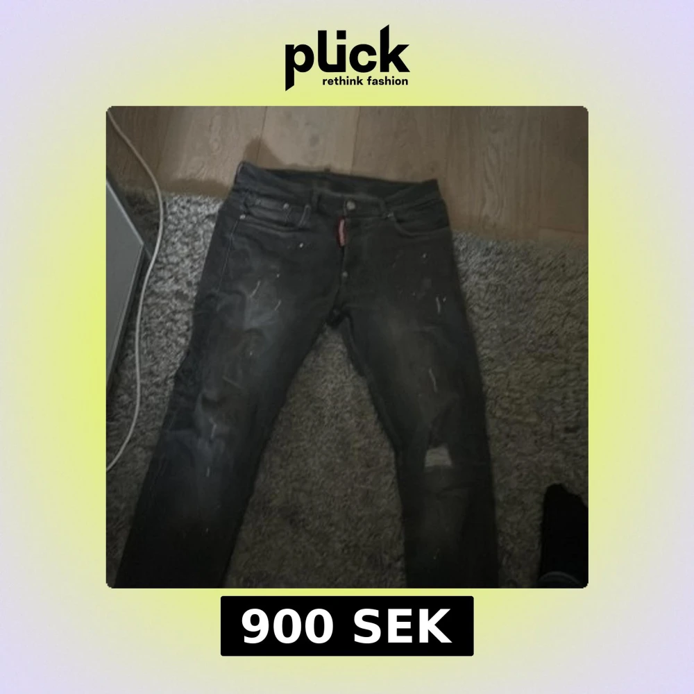 Säljer ett par svarta jeansbyxor med slitningar och en klassisk femficksdesign. Byxorna har en knappgylf och en röd etikett vid linningen. Perfekta för en avslappnad stil.