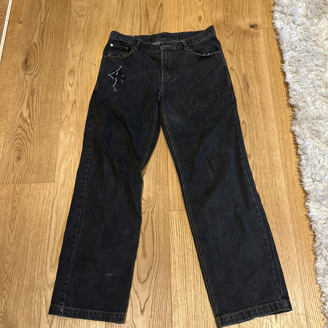 Unika svarta jeansbyxor från Lukamachain med stora vita tryck på baksidan där det står 'CHAIN WEAR'. Klassisk femficksmodell med dragkedja och raka ben. Perfekta för dig som vill sticka ut med din stil.