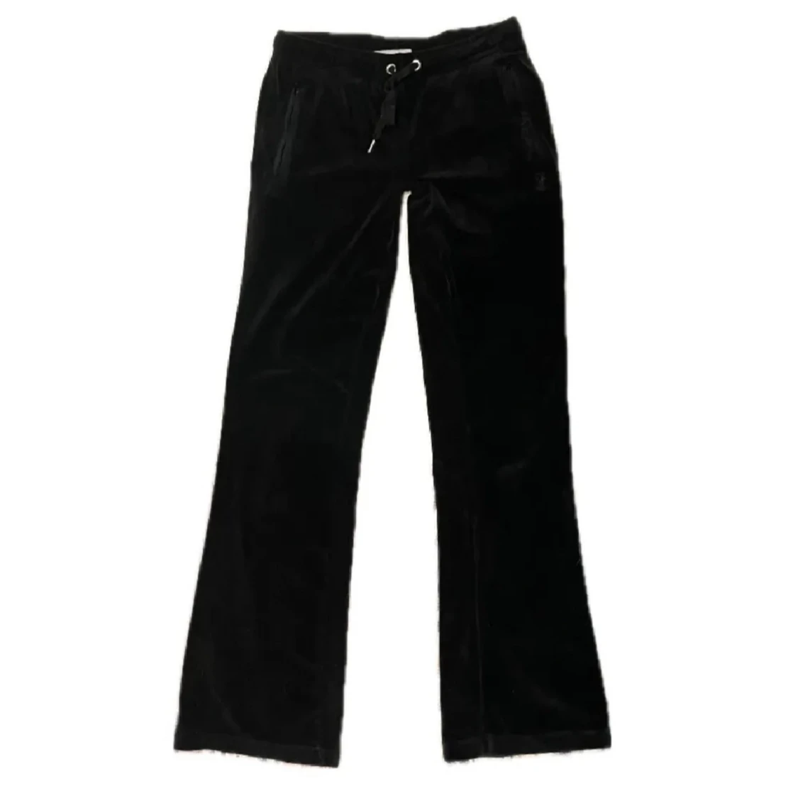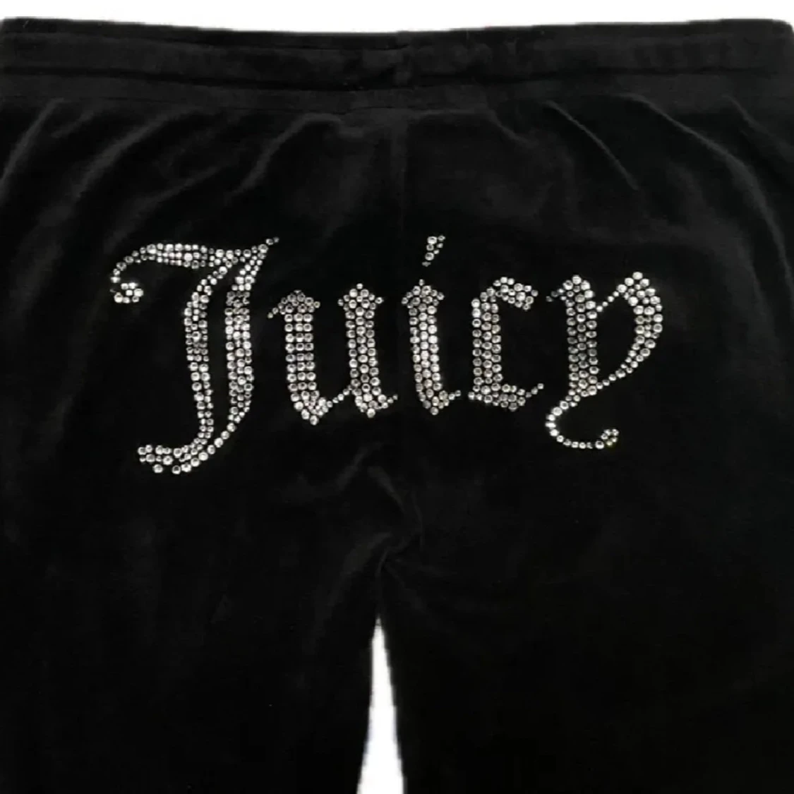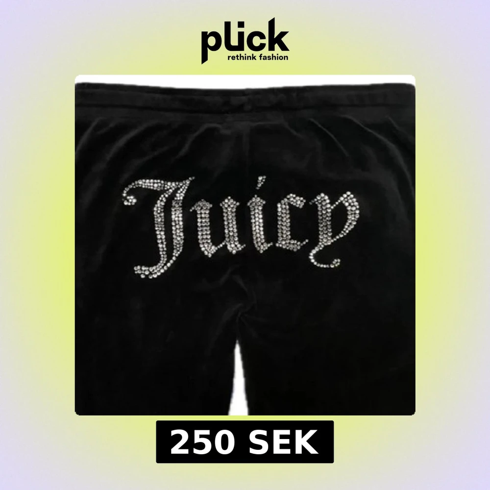 LÅNADE BILDER!!! Köpta här på Plick men aldrig använda av mig! Detta är förra ägarens beskrivning: Svarta Juicy Couture byxor🫶1-2 stenar har lossnat och har lagats i grenen eftersom de gick sönder (bild 3), dock inget som syns och annars är de i bra skick. Storlek L men passar mig som brukar ha M, skriv för äkthets bevis eller andra frågor❤️