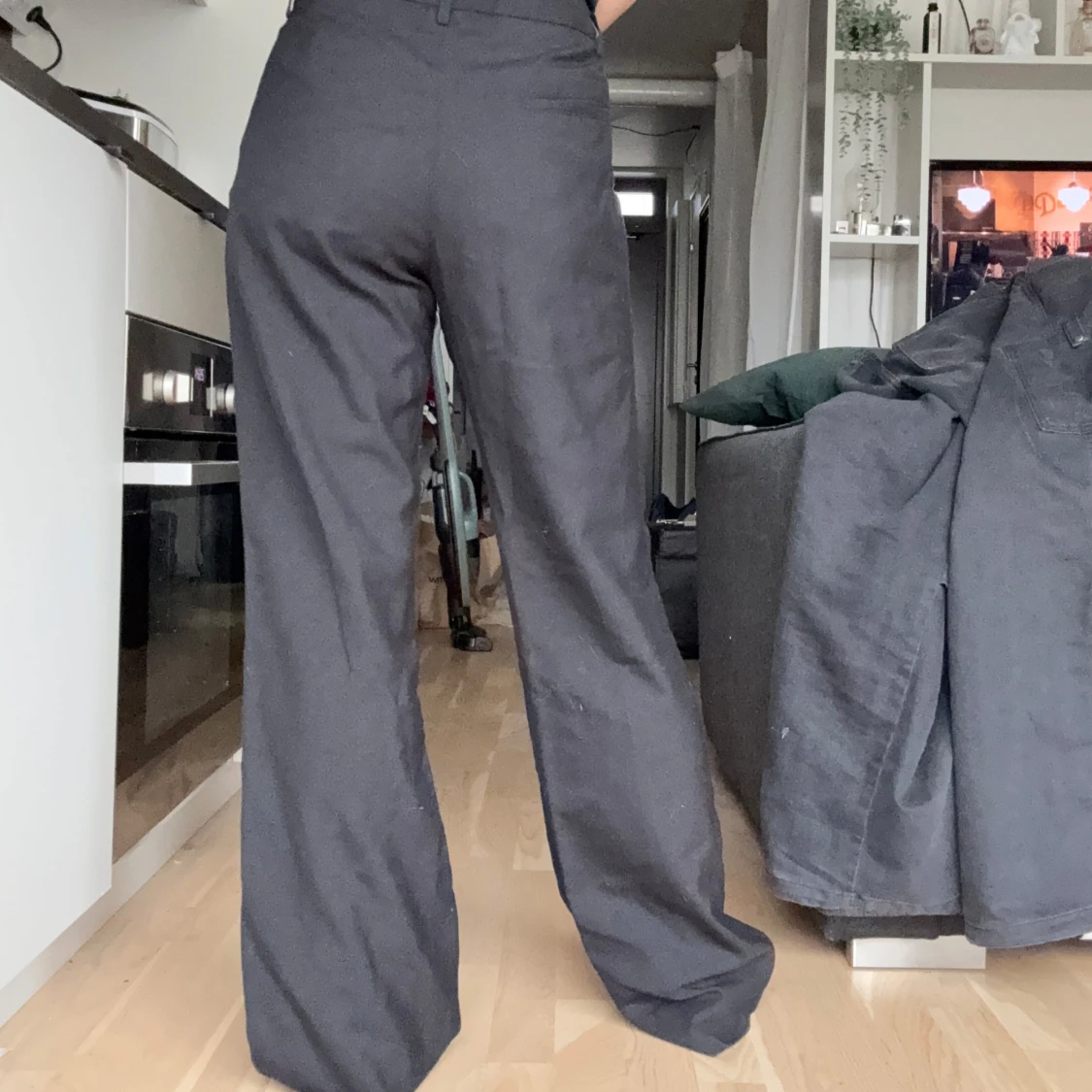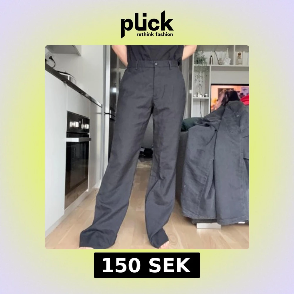 OBS!! ALLA MINA PLAGG GRATIS VID UPPHÄTMNING I RÅCKSTA!!! Säljer ett par svarta kostymbyxor med hög midja och raka, vida ben. Jag är 169 cm lång, så dessa passar bäst på någon som är längre, se längden på benen (uppenbarligen för långa för mig) de är dock för stora för mig på midjan så ta det i beräkning!