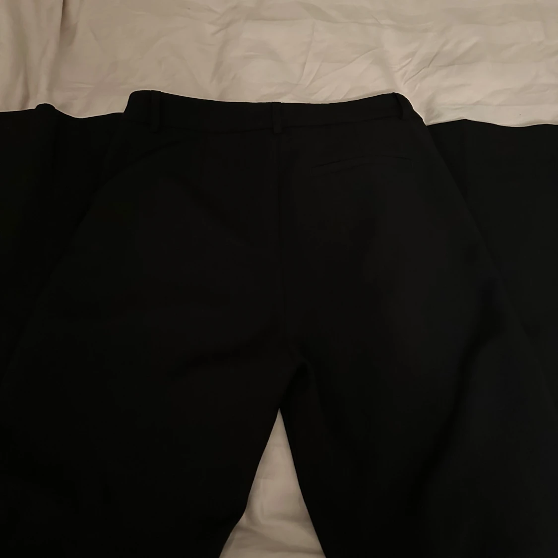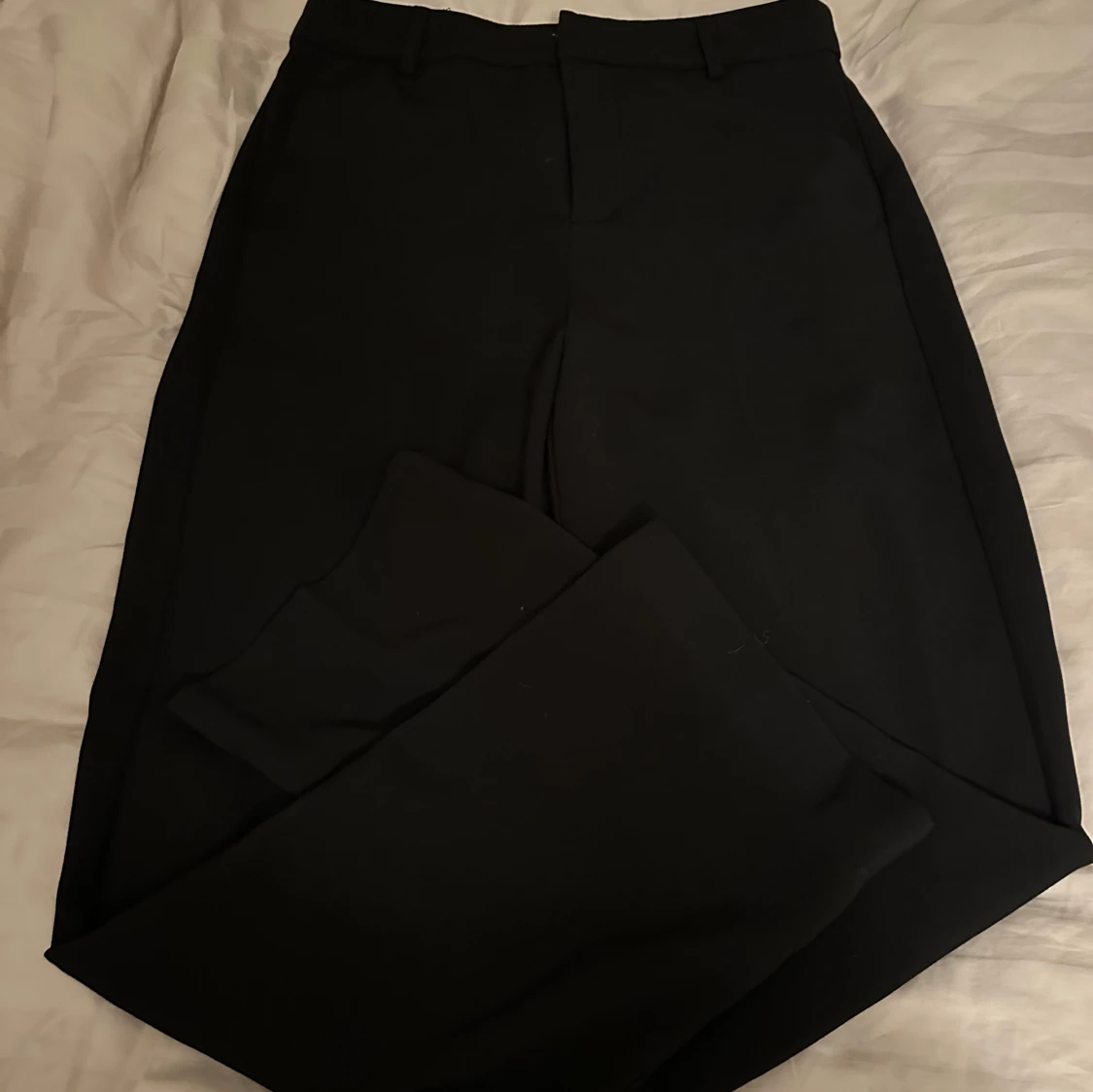 Säljer ett par klassiska svarta kostymbyxor med normal passform och raka ben. Byxorna har hällor för bälte och stängs med dragkedja och knapp och har även en hög midja . Perfekta till en stilren look.